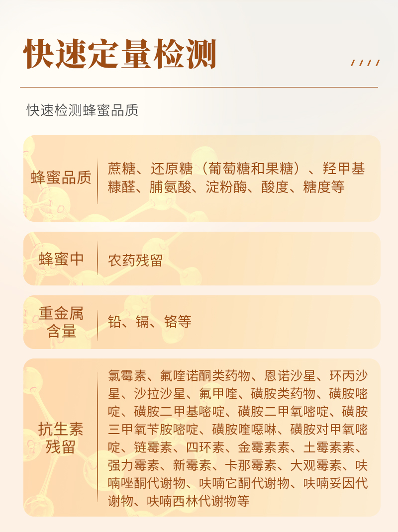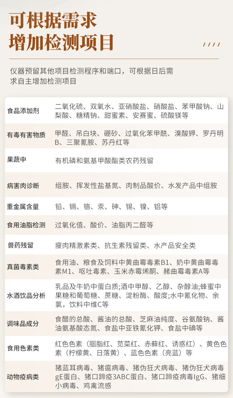 | 食品添加劑:二氧化硫、雙氧水、亞硝酸鹽、硝酸鹽、苯甲酸鈉、山梨酸鉀、糖精鈉、甜蜜素、木耳硫酸鎂等 | 有毒有害物質(zhì):甲醛、吊白塊、硼砂、過氧化苯甲酰、溴酸鉀、羅丹明B、三聚氰胺、蘇丹紅、工業(yè)堿、尿素、明礬等 | 果蔬:農(nóng)藥殘留(酶抑制率法) | 病害肉診斷:組胺、揮發(fā)性鹽基氮; | 重金屬含量:鉛、鎘、鉻、汞、砷、錫、鎳、鋁等; | 食用油脂: 過氧化值、酸價(jià)等 | 瘦肉精激素類(獸藥):鹽酸克倫特羅、沙丁胺醇、萊克多巴胺、己烯雌酚等 | 抗生素殘留類(獸藥):四環(huán)素類、硝基呋喃類、磺胺類、β-興奮劑類、沙星類、磺胺類、喹諾酮類,甲砜霉素,氟苯尼考,金剛烷胺、替米考星、慶大霉素、林可霉素、鏈霉素、恩諾沙星、環(huán)丙沙星、頭孢啦啶、青霉素、阿莫西林等 | 真菌毒素類:食用油、糧食及飼料中黃曲霉毒素B1、黃曲霉毒素總量,奶中黃曲霉毒素M1、嘔吐毒素、玉米赤霉烯酮、赭曲霉毒素A、T2毒素、伏馬毒素等; | 水酒飲品分析:酒中甲醇、乙醇、乳品及牛奶中蛋白質(zhì), | 調(diào)味品成分:食醋的總酸、醬油的總酸、芝麻油純度、谷氨酸鈉、醬油氨基酸態(tài)氮、食鹽中亞鐵氰化鉀、食鹽中碘等 | 食用色素類:紅色色素(胭脂紅、莧菜紅、赤蘚紅、誘惑紅)、黃色色素(檸檬黃、日落黃)、藍(lán)色色素(亮藍(lán))等 | 動(dòng)物疫病類:禽流感、新城疫、牛羊口蹄疫、牛羊結(jié)核病、牛羊包蟲、牛羊布病、小反芻獸、豬藍(lán)耳病毒、豬瘟病毒、豬偽狂犬病毒、豬細(xì)小、豬圓環(huán)、犬細(xì)小病毒、犬瘟熱病毒、犬狂犬病毒等; | 蜂蜜成分:果糖和葡萄糖、蔗糖、淀粉酶、酸度等 | 水產(chǎn)品安全類:孔雀石綠、氯霉素、呋喃妥因、呋喃西林、呋喃它酮、呋喃唑酮等 | 蛋類藥物殘留:氯霉素,四環(huán)素,磺胺類,喹諾酮類,呋喃西林,呋喃它酮,呋喃妥因,呋喃唑酮,氟苯尼考,阿莫西林、頭孢氨芐、紅霉素、鏈霉素等 |