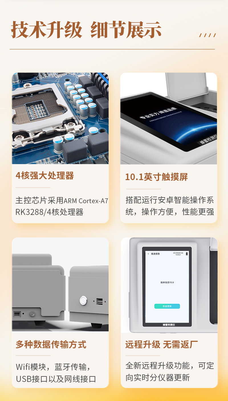 產(chǎn)品介紹: 山東天研儀器有限公司生產(chǎn)的高智能蜂蜜檢測儀為集成化食品安全快速檢測分析設(shè)備,采用臺(tái)式一體化設(shè)計(jì),可快速檢測200多種食品安全項(xiàng)目,包含非食用化學(xué)物質(zhì)、濫用食品添加劑、農(nóng)藥殘留、獸藥殘留、重金屬、病害肉、營養(yǎng)強(qiáng)化劑、抗生素類殘留、激素類殘留、真菌毒素類殘留、化學(xué)類殘留等項(xiàng)目的定性