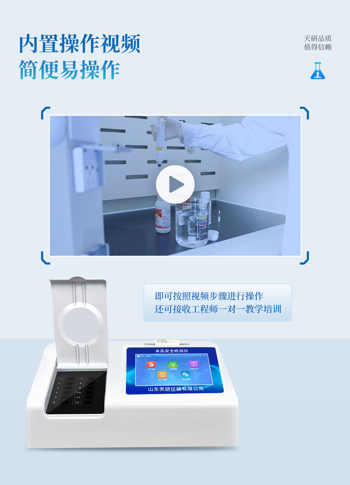 產(chǎn)品介紹:多功能食品安全檢測儀可快速檢測200多項目,包含非食用化學物質、濫用食品添加劑、農(nóng)藥殘留、獸藥殘留、重金屬、病害肉、營養(yǎng)強化劑、抗生素類殘留、激素類殘留、真菌毒素類殘留、化學類殘留等現(xiàn)場的定性定量檢測。該多功能食品安全檢測儀為集成化食品安全快速檢測分析設備,廣泛應用于市場監(jiān)管局、檢測中心、衛(wèi)生