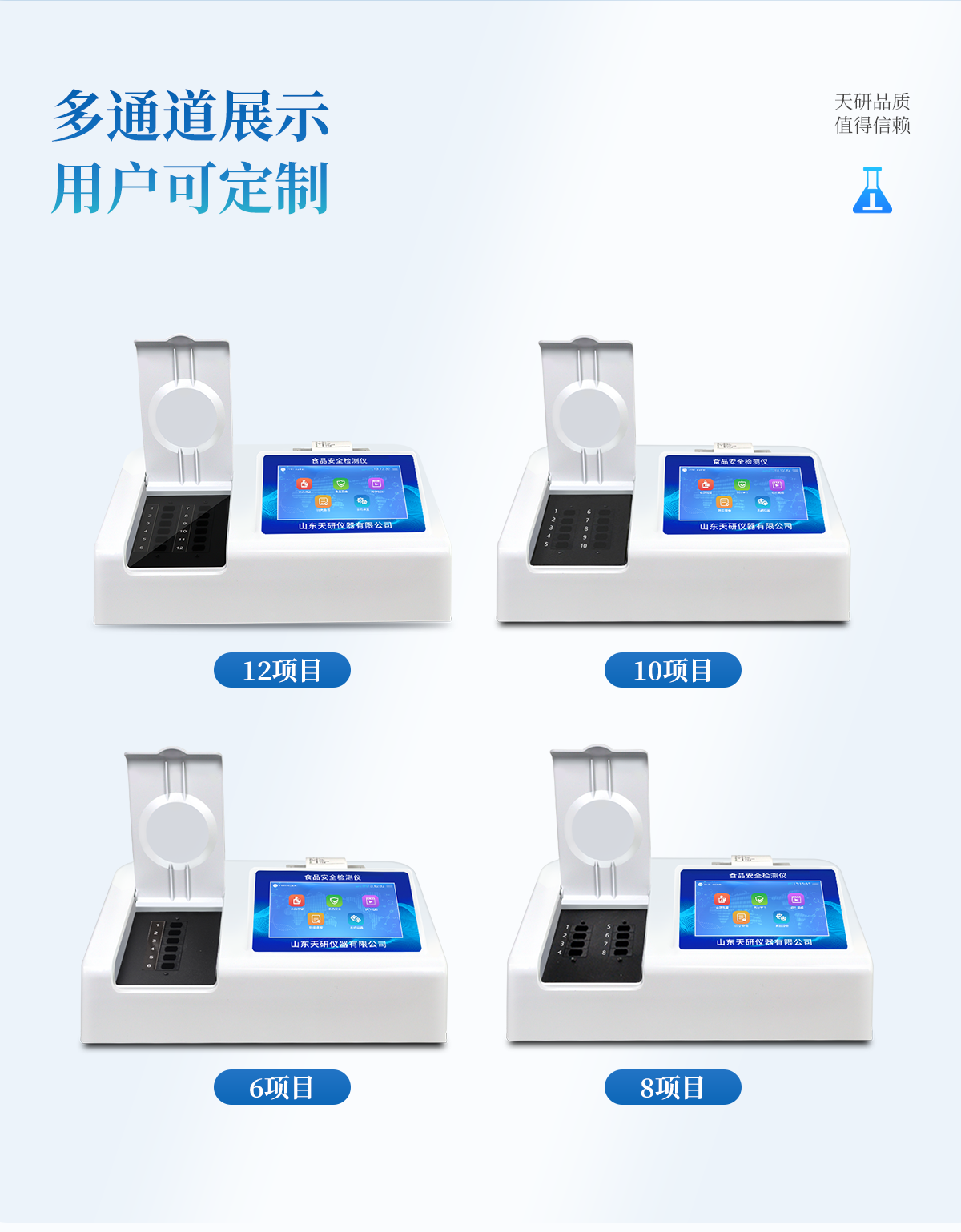 多功能食品安全檢測(cè)儀可快速檢測(cè)200多項(xiàng)目,包含非食用化學(xué)物質(zhì)、濫用食品添加劑、農(nóng)藥殘留、獸藥殘留、重金屬、病害肉、營(yíng)養(yǎng)強(qiáng)化劑、抗生素類(lèi)殘留、激素類(lèi)殘留、真菌毒素類(lèi)殘留、化學(xué)類(lèi)殘留等現(xiàn)場(chǎng)的定性定量檢測(cè)。該多功能食品安全檢測(cè)儀為集成化食品安全快速檢測(cè)分析設(shè)備,廣泛應(yīng)用于市場(chǎng)監(jiān)管局、檢測(cè)中心、衛(wèi)生監(jiān)督部門(mén)、農(nóng)業(yè)部門(mén)、院校及各單位食堂、食品肉產(chǎn)品深加工企業(yè)、商超市場(chǎng)、司法部門(mén)、餐飲機(jī)構(gòu)、養(yǎng)殖場(chǎng)、屠宰場(chǎng)、檢驗(yàn)檢疫部門(mén)等單位使用。