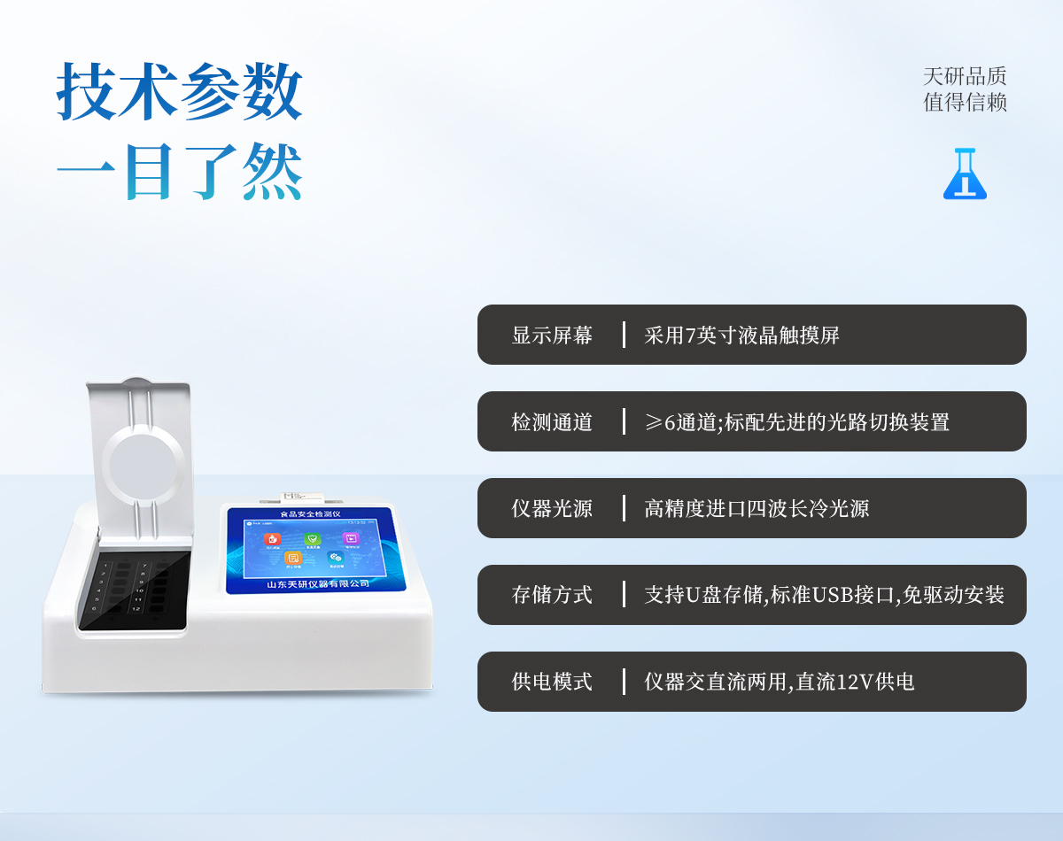 產(chǎn)品介紹: 多功能食品安全檢測(cè)儀可快速檢測(cè)200多項(xiàng)目,包含非食用化學(xué)物質(zhì)、濫用食品添加劑、農(nóng)藥殘留、獸藥殘留、重金屬、病害肉、營(yíng)養(yǎng)強(qiáng)化劑、抗生素類(lèi)殘留、激素類(lèi)殘留、真菌毒素類(lèi)殘留、化學(xué)類(lèi)殘留等現(xiàn)場(chǎng)的定性定量檢測(cè)。該多功能食品安全檢測(cè)儀為集成化食品安全快速檢測(cè)分析設(shè)備,廣泛應(yīng)用于市場(chǎng)