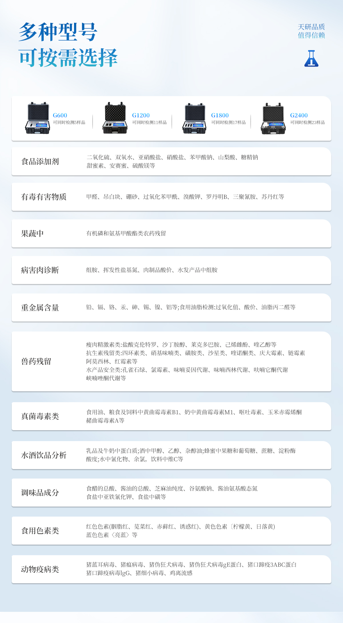 | 食品添加劑:二氧化硫、雙氧水、亞硝酸鹽、硝酸鹽、苯甲酸鈉、山梨酸、糖精鈉、甜蜜素、安賽蜜、硫酸鎂等 | 有毒有害物質(zhì):甲醛、吊白塊、硼砂、過氧化苯甲酰、溴酸鉀、羅丹明B、三聚氰胺、蘇丹紅等 | 果蔬中:有機磷和氨基甲酸酯類農(nóng)藥殘留; | 病害肉診斷:組胺、揮發(fā)性鹽基氮、肉制品酸價、水發(fā)產(chǎn)品中組胺 | 重金屬含量:鉛、鎘、鉻、汞、砷、錫、鎳、鋁等;食用油脂檢測:過氧化值、酸價、油脂丙二醛等。 | 瘦肉精激素類(獸藥):鹽酸克倫特羅、沙丁胺醇、萊克多巴胺、己烯雌酚、喹乙醇等 | 抗生素殘留類(獸藥):四環(huán)素類、硝基呋喃類、磺胺類、沙星類、喹諾酮類、慶大霉素、鏈霉素、阿莫西林、紅霉素等 | 水產(chǎn)品安全類:孔雀石綠、氯霉素、呋喃妥因代謝、呋喃西林代謝、呋喃它酮代謝、呋喃唑酮代謝等 | 真菌毒素類:食用油、糧食及飼料中黃曲霉毒素B1、奶中黃曲霉毒素M1、嘔吐毒素、玉米赤霉烯酮、赭曲霉毒素A等 | 水酒飲品分析:乳品及牛奶中蛋白質(zhì);酒中甲醇、乙醇、雜醇油;蜂蜜中果糖和葡萄糖、蔗糖、淀粉酶、酸度;水中氰化物、余氯,飲料中維C等 | 調(diào)味品成分:食醋的總酸、醬油的總酸、芝麻油純度、谷氨酸鈉、醬油氨基酸態(tài)氮、食鹽中亞鐵氰化鉀、食鹽中碘等 | 食用色素類:紅色色素(胭脂紅、莧菜紅、赤蘚紅、誘惑紅)、黃色色素(檸檬黃、日落黃)、藍(lán)色色素(亮藍(lán))等 | 動物疫病類:豬藍(lán)耳病毒、豬瘟病毒、豬偽狂犬病毒、豬偽狂犬病毒gE蛋白、豬口蹄疫3ABC蛋白、豬口蹄疫病毒IgG、豬細(xì)小病毒、雞禽流感等 |