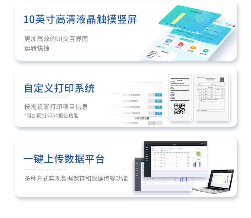 | 安卓智能操作系統(tǒng),采用更加**和人性化操作,儀器具有無(wú)線聯(lián)網(wǎng)上傳功能,快速上傳數(shù)據(jù),進(jìn)行數(shù)據(jù)統(tǒng)計(jì)和分析。 | 智能化程度高,儀器具有自檢功能:具有開(kāi)機(jī)自檢和調(diào)零功能,具有自動(dòng)檢測(cè)重復(fù)性功能;同時(shí),檢測(cè)完成可自動(dòng)打印檢測(cè)報(bào)告和二維碼。手機(jī)掃碼可顯示出詳細(xì)檢測(cè)信息。 | 儀器帶有監(jiān)管平臺(tái),數(shù)據(jù)可局域網(wǎng)和互聯(lián)網(wǎng)數(shù)據(jù)上傳,檢測(cè)結(jié)果直接傳至食品安全監(jiān)管平臺(tái)。進(jìn)行區(qū)域食品安全監(jiān)管及大數(shù)據(jù)分析處理與數(shù)據(jù)統(tǒng)計(jì),檢測(cè)區(qū)域食品安全長(zhǎng)短期動(dòng)態(tài),達(dá)到食品安全問(wèn)題預(yù)估、預(yù)警 。 | 樣品處理簡(jiǎn)單省力,整體操作快速、安全、便捷。 | 儀器具有自身保護(hù)功能,可設(shè)置用戶名及密碼,防止非工作人員操作等。 | 內(nèi)置強(qiáng)大的數(shù)據(jù)庫(kù),可在儀器上直接選擇樣品名稱、檢測(cè)指標(biāo)、送檢單位等信息,也可在儀器上直接編輯錄入樣品名稱、檢測(cè)指標(biāo)、送檢單位等信息并保存進(jìn)樣品數(shù)據(jù)庫(kù),方便后期操作調(diào)取使用。 | 儀器具有重新校準(zhǔn)、鎖定、恢復(fù)出廠設(shè)置功能。 |