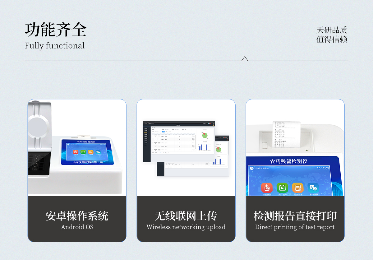 | 乙酰膽堿酯酶和丁酰膽堿酯酶試劑均可以使用,符合國家標(biāo)準(zhǔn)和農(nóng)業(yè)部標(biāo)準(zhǔn)的要求。 | 自動(dòng)判斷樣品是否合格,檢測(cè)結(jié)果更加直觀。 | 儀器具有100多種蔬菜名稱菜單庫,分類管理,并可按需添加或刪除蔬菜名,編輯蔬菜名稱,可直接打印出蔬菜名稱。 | 檢測(cè)通道:12個(gè)檢測(cè)通道,可以同時(shí)測(cè)試多個(gè)樣品,循環(huán)檢測(cè),即放即檢,每個(gè)樣品由程序控制分別獨(dú)立工作,不會(huì)互相干擾。 | 智能操作系統(tǒng),采用更加人性化操作,主控采用多核處理器,主頻1.88Ghz,運(yùn)轉(zhuǎn)速度更快速,穩(wěn)定性更強(qiáng)。 | 顯示方式:7英寸高靈敏真彩觸摸屏顯示,人性化中文操作界面,讀數(shù)直觀、簡(jiǎn)單。 | 打印機(jī)采用串口5v打印,可選擇手動(dòng)打印或者自動(dòng)打印,三分鐘出打印結(jié)果,打印格式為檢測(cè)人姓名、吸光度差值、檢測(cè)時(shí)間、檢測(cè)機(jī)構(gòu)、樣品名稱及結(jié)果判定。 | 光源采用進(jìn)口超高亮發(fā)光二極管,具有低功耗、高精度、穩(wěn)定性強(qiáng)、光源可控可以關(guān)掉不使用的光源,響應(yīng)速度快等優(yōu)點(diǎn)。 | 智能恒流穩(wěn)壓,光強(qiáng)自動(dòng)校準(zhǔn),長時(shí)間連續(xù)工作光源無溫漂現(xiàn)象。 | 儀器具有GPRS遠(yuǎn)傳功能,可插手機(jī)卡實(shí)現(xiàn)數(shù)據(jù)遠(yuǎn)傳平臺(tái),wifi聯(lián)網(wǎng)功能,可將數(shù)據(jù)快速上傳電腦,進(jìn)行數(shù)據(jù)管理與統(tǒng)計(jì)。 | 采用USB2.0接口設(shè)計(jì),方便數(shù)據(jù)的存貯和移動(dòng),并可隨時(shí)與計(jì)算機(jī)直接相連,并且可用計(jì)算機(jī)控制儀器。實(shí)現(xiàn)數(shù)據(jù)查詢、瀏覽、分析、統(tǒng)計(jì)、打印等。 | 智能化程度高,儀器具有自檢功能:具有開機(jī)自檢和調(diào)零功能,具有自動(dòng)檢測(cè)重復(fù)性功能 | 儀器具有自身保護(hù)功能,可設(shè)置用戶名及密碼,防止非工作人員操作等。 | 采用DC12v直流供電,安全系統(tǒng)更高,并且配備6A鋰電池充電器。 | 儀器具有重新校準(zhǔn)、鎖定、恢復(fù)出廠設(shè)置功能。 |