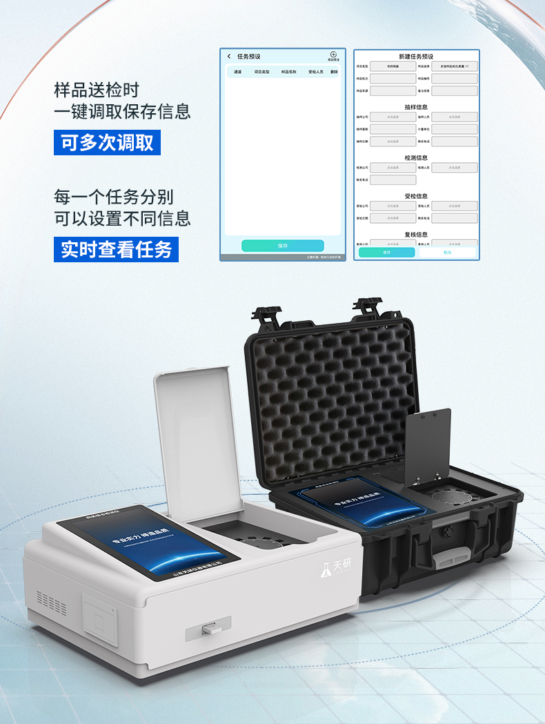 | 儀器采用臺式一體化系統(tǒng)檢測技術(shù),將分光光度模塊、膠體金檢測模塊、新型農(nóng)殘檢測模塊、數(shù)字化管理模塊、無線通訊模塊高度集成于一體,支持檢測200種食品安全檢測項目,同時預(yù)留升級檢測方法。 | 儀器檢測模塊標(biāo)準(zhǔn)化、智能化,可隨意自由組合。檢測箱體內(nèi)置多個標(biāo)準(zhǔn)檢測單元,檢測模塊可以調(diào)整配置。 | 儀器采用全新安卓智能系統(tǒng),主控芯片采用 ARM Cortex-A7,RK3288/4核處理器,10.1寸高清液晶觸摸豎屏,更加**的UI交互界面,運轉(zhuǎn)快捷;儀器配備無線通信模塊: 4G(APN)通訊模塊、Wifi模塊,藍(lán)牙傳輸,同時具有雙USB接口以及RJ45接口能以多種方式實現(xiàn)數(shù)據(jù)保存和數(shù)據(jù)傳輸功能。 | 創(chuàng)新檢測模式: | ★檢測通道:≥12通道;采用精密旋轉(zhuǎn)比色池設(shè)計,使用同芯片同光源校準(zhǔn)精度,解決不同光源之間的誤差值。1-12通道間誤差0.1%。(**號:ZL202022821055.2) | ★儀器具有自動識別比色皿檢測功能,即:將樣品比色皿放入儀器后,點擊樣品檢測,儀器自動識別比色皿進(jìn)行通道檢測。 | 進(jìn)口高精光源: | 高精度進(jìn)口四波長冷光源,通道配置 410、520、590、630nm 波長光源,一個光源芯片驅(qū)動一個光源,誤差極小,每臺設(shè)備單獨**校準(zhǔn)光源,**比對,同時參照四種不同波段光源全方位覆蓋市面上99%的農(nóng)殘食品項目檢測。 | 膠體金模塊檢測方式: | 采用COMS實時成像技術(shù),可采集多個畫面,支持3個金標(biāo)同時讀卡,通過不同顏色的灰度變化,一秒精準(zhǔn)得出結(jié)果。 | 智能化操作系統(tǒng): | 便捷操作系統(tǒng):設(shè)備檢測時可在同一檢測界面自動對應(yīng)相關(guān)檢測通道一次性選擇1-12個樣品名稱,無須退出界面,節(jié)省操作時間。 | 數(shù)據(jù)集成系統(tǒng):設(shè)備首頁自動統(tǒng)計檢測數(shù)據(jù)包含:周檢測數(shù)據(jù)、月檢測數(shù)據(jù),全部檢測總數(shù)量,均包含檢測總數(shù),合格數(shù),不合格數(shù),以及相關(guān)柱形分析圖,對各項檢測數(shù)據(jù)清晰掌握,無需電腦查詢,更加快捷直觀。 | 項目預(yù)設(shè)系統(tǒng):支持添加單個及多個相同或不相同的任務(wù)預(yù)設(shè),一鍵快速調(diào)取,每一個任務(wù)分別可以設(shè)置不同的樣品、批次、編號、來源、備注、抽樣信息、檢測信息、受檢信息、復(fù)核信息等更多信息。無縫鏈接平臺和APP實時查看下發(fā)任務(wù)。 | 數(shù)據(jù)監(jiān)管系統(tǒng):同步對接監(jiān)管平臺,數(shù)據(jù)可局域網(wǎng)和互聯(lián)網(wǎng)數(shù)據(jù)上傳,檢測結(jié)果可選擇直接傳至食品安全監(jiān)管平臺。集成OSS輸出存儲服務(wù)、區(qū)分設(shè)備定向管理應(yīng)用,進(jìn)行區(qū)域食品安全監(jiān)管及大數(shù)據(jù)分析處理與數(shù)據(jù)統(tǒng)計,檢測區(qū)域食品安全長短期動態(tài),達(dá)到食品安全問題預(yù)估、預(yù)警。 | 自定義打印系統(tǒng):內(nèi)置全新打印系統(tǒng),新創(chuàng)自定義打印方式,可按需靈活設(shè)置開啟或關(guān)閉:產(chǎn)品合格證(國家農(nóng)業(yè)部標(biāo)準(zhǔn)要求),二維碼,抽樣信息、檢測信息,受檢信息、復(fù)核信息、抽樣日期、檢測日期等信息的打印。 | 系統(tǒng)遠(yuǎn)程更新功能:可定向分客戶分儀器更新系統(tǒng),按照不同客戶后期實際需求添加項目,無需機器返廠,即可遠(yuǎn)程實時升級全新系統(tǒng),節(jié)省時間成本及避免運輸造成設(shè)備損壞。 | 儀器主機采用一體化防水、抗壓、防撞擊、防腐蝕箱體設(shè)計,同時配備交直流供電,可連接車載電源,可選配大容量充電鋰電池,滿足現(xiàn)場野外檢測需求。 | 安全證書,放心保障:儀器具有中國計量科學(xué)研究院校準(zhǔn)證書,**認(rèn)證。 |