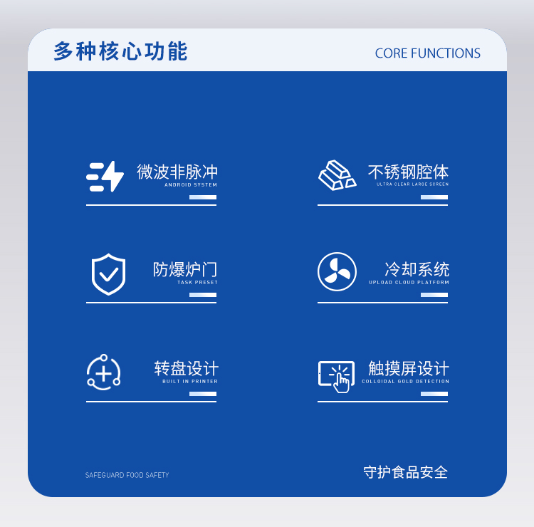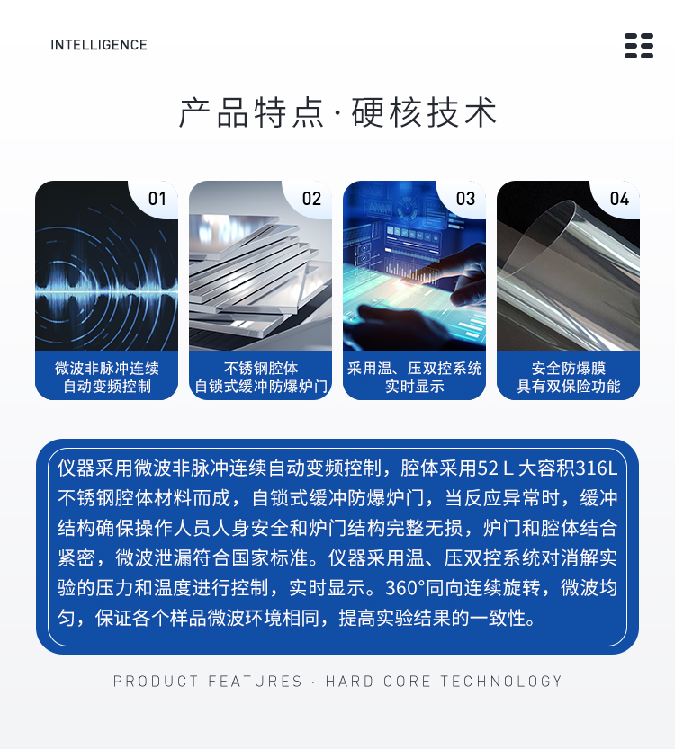 儀器采用微波非脈沖連續(xù)自動(dòng)變頻控制,延長(zhǎng)了儀器的使用壽命和電磁波的均勻性,腔體采用52L大容積316L不銹鋼腔體材料制成,自鎖式緩沖防爆爐門(mén),當(dāng)反應(yīng)異常時(shí),緩沖結(jié)構(gòu)確保操作人員人身安全和爐門(mén)結(jié)構(gòu)完整無(wú)損,爐門(mén)和腔體結(jié)合緊密,微波泄漏符合國(guó)家標(biāo)準(zhǔn)。儀器采用溫、壓雙控系統(tǒng)對(duì)消解實(shí)驗(yàn)的壓力和溫度進(jìn)行控制,實(shí)時(shí)顯示。360°同向連續(xù)旋轉(zhuǎn),微波均勻,確定各個(gè)樣品微波環(huán)境相同,提高實(shí)驗(yàn)結(jié)果的一致性。當(dāng)罐內(nèi)的壓力超過(guò)設(shè)定的保護(hù)值時(shí),微波會(huì)自動(dòng)停止加熱。安全防爆膜具有雙保險(xiǎn)功能,當(dāng)罐內(nèi)的壓力超過(guò)防爆膜所能承受的壓力時(shí),防爆膜先行破裂,氣體瀉出,防止罐體受損和對(duì)人體的傷害。