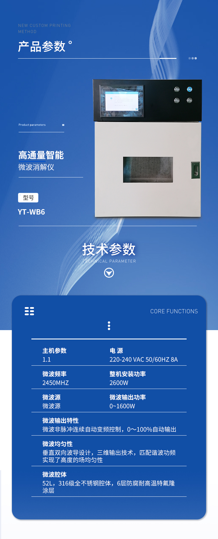 產(chǎn)品說(shuō)明:TY-WB20高通量智能微波消解儀為樣品提供了快速,安全,自動(dòng)化的解決方案,在高壓條件下加快樣品消解反應(yīng)的速度,廣泛應(yīng)用于食品、環(huán)境保護(hù)、疾病控制、質(zhì)量監(jiān)督、商品檢驗(yàn)、科研院所等領(lǐng)域。產(chǎn)品特點(diǎn):儀器采用微波非脈沖連續(xù)自動(dòng)變頻控制,延長(zhǎng)了儀器的使用壽命和電磁波的均勻性,腔體采用52L大容積316L不銹鋼腔