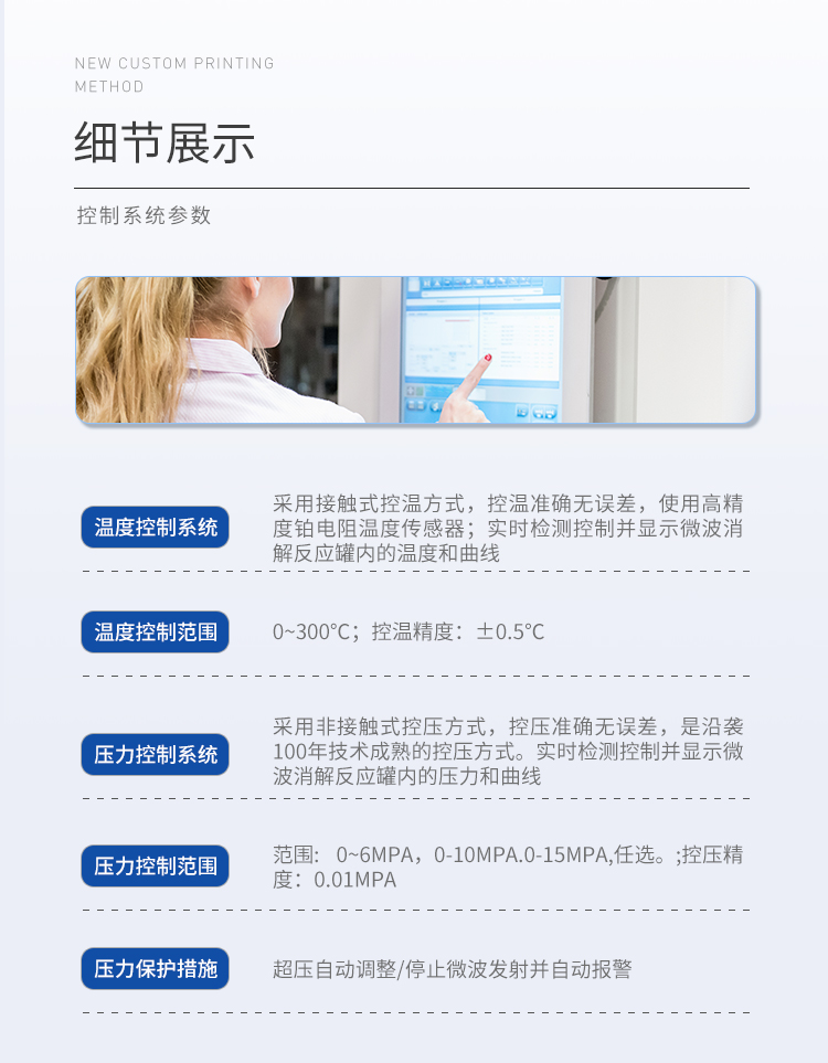 | (1)溫度控制系統(tǒng):采用接觸式控溫方式,控溫準(zhǔn)確無(wú)誤差,使用高精度鉑電阻溫度傳感器;實(shí)時(shí)檢測(cè)控制并顯示微波消解反應(yīng)罐內(nèi)的溫度和曲線; | (2)溫度控制范圍:0~300℃;控溫精度:±0.5℃; | (3)控溫能力:速率升溫功能。 | (4)壓力控制系統(tǒng):采用非接觸式控壓方式,控壓準(zhǔn)確無(wú)誤差,是沿襲100年技術(shù)成熟的控壓方式。實(shí)時(shí)檢測(cè)控制并顯示微波消解反應(yīng)罐內(nèi)的壓力和曲線; | (5)壓力控制范圍:范圍: 0~6MPa,0-10MPa.0-15MPa,任選。;控壓精度:0.01MPa; | (6)壓力保護(hù):超壓自動(dòng)調(diào)整/停止微波發(fā)射并自動(dòng)報(bào)警; |