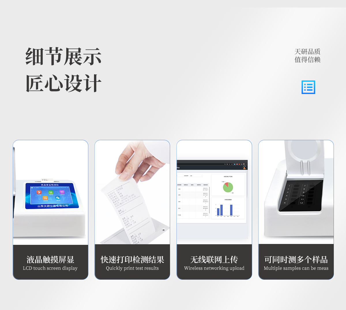 | 儀器采用臺(tái)式一體化系統(tǒng)檢測(cè)技術(shù),將分光光度模塊、新型農(nóng)殘檢測(cè)模塊、數(shù)字化管理模塊、無(wú)線通訊模塊高度集成于一體,支持檢測(cè)200種食品安全檢測(cè)項(xiàng)目,同時(shí)預(yù)留升級(jí)檢測(cè)方法。 | 儀器檢測(cè)模塊標(biāo)準(zhǔn)化、智能化,可隨意自由組合。檢測(cè)箱體內(nèi)置多個(gè)標(biāo)準(zhǔn)檢測(cè)單元,檢測(cè)模塊可以調(diào)整配置。 | 儀器采用全新安卓智能系統(tǒng),主控芯片采用 ARM Cortex-A7,RK3288/4核處理器,10.1寸高清液晶觸摸豎屏,更加**的UI交互界面,運(yùn)轉(zhuǎn)快捷;儀器配備無(wú)線通信模塊: 4G(APN)通訊模塊、Wifi模塊,藍(lán)牙傳輸,同時(shí)具有雙USB接口以及RJ45接口能以多種方式實(shí)現(xiàn)數(shù)據(jù)保存和數(shù)據(jù)傳輸功能。 | 創(chuàng)新檢測(cè)模式: | ★檢測(cè)通道:≥12通道;采用精密旋轉(zhuǎn)比色池設(shè)計(jì),使用同芯片同光源校準(zhǔn)精度,解決不同光源之間的誤差值。1-12通道間誤差0.1%。(**號(hào):ZL202022821055.2) | ★儀器具有自動(dòng)識(shí)別比色皿檢測(cè)功能,即:將樣品比色皿放入儀器后,點(diǎn)擊樣品檢測(cè),儀器自動(dòng)識(shí)別比色皿進(jìn)行通道檢測(cè)。 | 進(jìn)口高精光源: | 高精度進(jìn)口四波長(zhǎng)冷光源,通道配置 410、520、590、630nm 波長(zhǎng)光源,一個(gè)光源芯片驅(qū)動(dòng)一個(gè)光源,誤差極小,每臺(tái)設(shè)備單獨(dú)**校準(zhǔn)光源,**比對(duì),同時(shí)參照四種不同波段光源全方位覆蓋市面上99%的農(nóng)殘食品項(xiàng)目檢測(cè)。 | 智能化操作系統(tǒng): | 便捷操作系統(tǒng):設(shè)備檢測(cè)時(shí)可在同一檢測(cè)界面自動(dòng)對(duì)應(yīng)相關(guān)檢測(cè)通道一次性選擇1-12個(gè)樣品名稱,無(wú)須退出界面,節(jié)省操作時(shí)間。 | 數(shù)據(jù)集成系統(tǒng):設(shè)備首頁(yè)自動(dòng)統(tǒng)計(jì)檢測(cè)數(shù)據(jù)包含:周檢測(cè)數(shù)據(jù)、月檢測(cè)數(shù)據(jù),全部檢測(cè)總數(shù)量,均包含檢測(cè)總數(shù),合格數(shù),不合格數(shù),以及相關(guān)柱形分析圖,對(duì)各項(xiàng)檢測(cè)數(shù)據(jù)清晰掌握,無(wú)需電腦查詢,更加快捷直觀。 | 項(xiàng)目預(yù)設(shè)系統(tǒng):支持添加單個(gè)及多個(gè)相同或不相同的任務(wù)預(yù)設(shè),一鍵快速調(diào)取,每一個(gè)任務(wù)分別可以設(shè)置不同的樣品、批次、編號(hào)、來源、備注、抽樣信息、檢測(cè)信息、受檢信息、復(fù)核信息等更多信息。無(wú)縫鏈接平臺(tái)和APP實(shí)時(shí)查看下發(fā)任務(wù)。 | 數(shù)據(jù)監(jiān)管系統(tǒng):同步對(duì)接監(jiān)管平臺(tái),數(shù)據(jù)可局域網(wǎng)和互聯(lián)網(wǎng)數(shù)據(jù)上傳,檢測(cè)結(jié)果可選擇直接傳至食品安全監(jiān)管平臺(tái)。集成OSS輸出存儲(chǔ)服務(wù)、區(qū)分設(shè)備定向管理應(yīng)用,進(jìn)行區(qū)域食品安全監(jiān)管及大數(shù)據(jù)分析處理與數(shù)據(jù)統(tǒng)計(jì),檢測(cè)區(qū)域食品安全長(zhǎng)短期動(dòng)態(tài),達(dá)到食品安全問題預(yù)估、預(yù)警。 | 自定義打印系統(tǒng):內(nèi)置全新打印系統(tǒng),新創(chuàng)自定義打印方式,可按需靈活設(shè)置開啟或關(guān)閉:產(chǎn)品合格證(國(guó)家農(nóng)業(yè)部標(biāo)準(zhǔn)要求),二維碼,抽樣信息、檢測(cè)信息,受檢信息、復(fù)核信息、抽樣日期、檢測(cè)日期等信息的打印。 | 系統(tǒng)遠(yuǎn)程更新功能:可定向分客戶分儀器更新系統(tǒng),按照不同客戶后期實(shí)際需求添加項(xiàng)目,無(wú)需機(jī)器返廠,即可遠(yuǎn)程實(shí)時(shí)升級(jí)全新系統(tǒng),節(jié)省時(shí)間成本及避免運(yùn)輸造成設(shè)備損壞。 | 儀器主機(jī)采用一體化防水、抗壓、防撞擊、防腐蝕箱體設(shè)計(jì),同時(shí)配備交直流供電,可連接車載電源,可選配大容量充電鋰電池,滿足現(xiàn)場(chǎng)野外檢測(cè)需求。 | 安全證書,放心保障:儀器具有中國(guó)計(jì)量科學(xué)研究院校準(zhǔn)證書,**認(rèn)證。 |