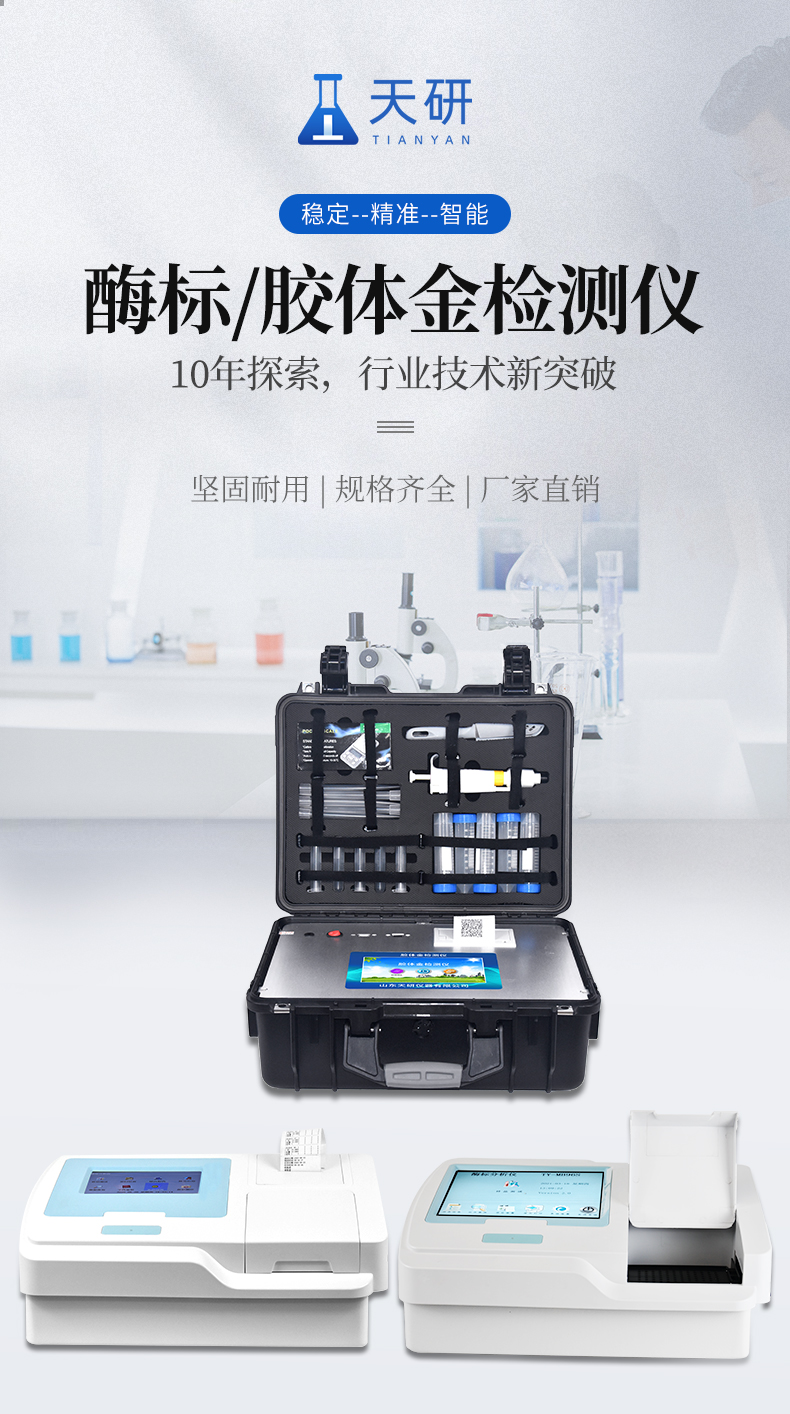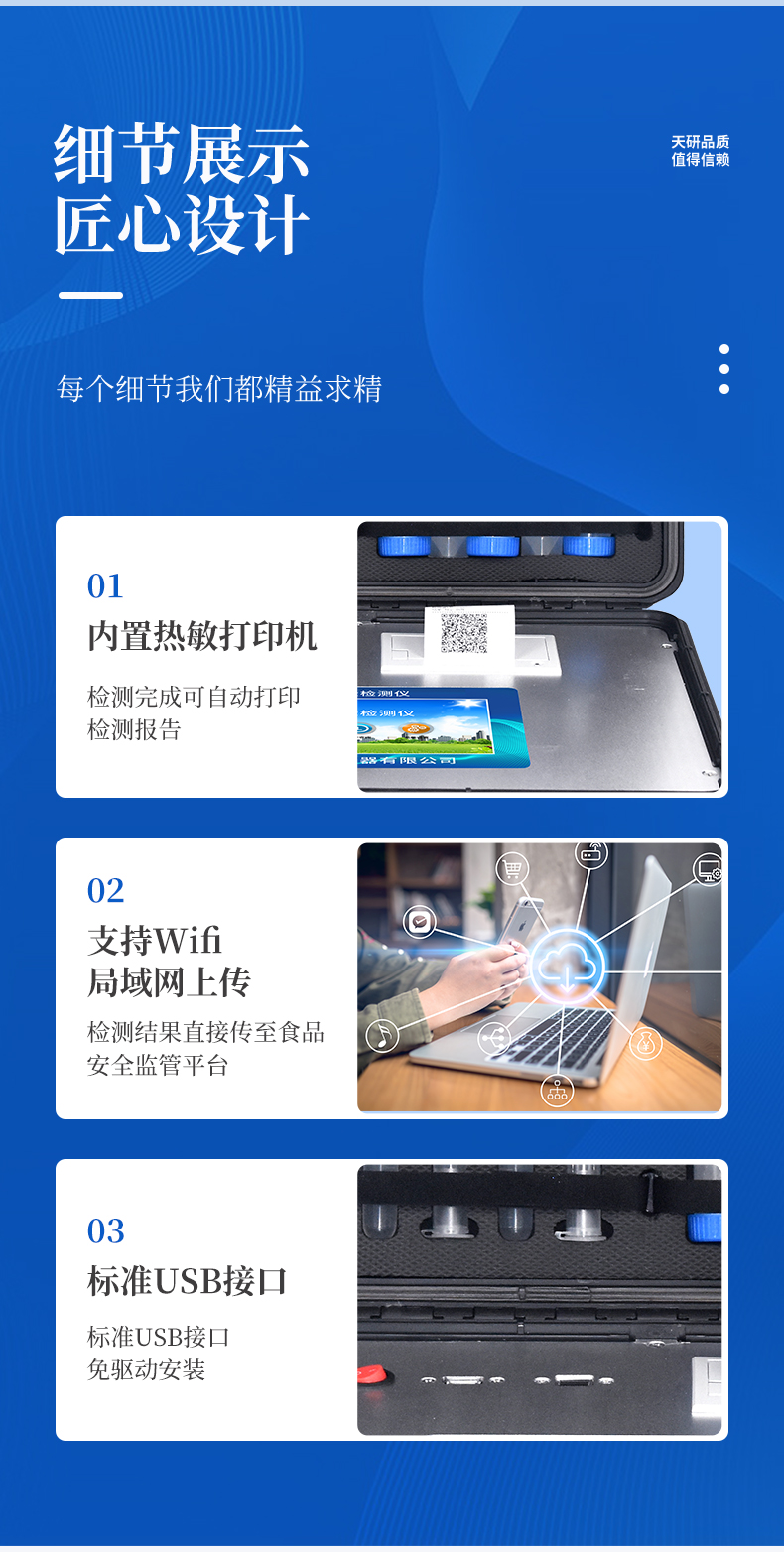 | 安卓智能操作系統(tǒng),采用更加**UI交互界面,儀器具有wifi聯(lián)網(wǎng)上傳、4G聯(lián)網(wǎng)傳輸、GPRS無(wú)線遠(yuǎn)傳、網(wǎng)線連接功能,快速批量上傳數(shù)據(jù)。 | 智能化程度高,儀器具有自檢功能:具有開(kāi)機(jī)自檢和調(diào)零功能,具有自動(dòng)檢測(cè)重復(fù)性功能。 | 新一代高速熱敏打印機(jī),檢測(cè)完成可自動(dòng)打印檢測(cè)報(bào)告和二維碼。 | 儀器帶有監(jiān)管平臺(tái),數(shù)據(jù)可局域網(wǎng)和互聯(lián)網(wǎng)數(shù)據(jù)上傳,檢測(cè)結(jié)果直接傳至食品安全監(jiān)管平臺(tái)。進(jìn)行區(qū)域食品安全監(jiān)管及大數(shù)據(jù)分析處理與數(shù)據(jù)統(tǒng)計(jì),檢測(cè)區(qū)域食品安全長(zhǎng)短期動(dòng)態(tài),達(dá)到食品安全問(wèn)題預(yù)估、預(yù)警 | 一體化便攜式快檢設(shè)備,滿足現(xiàn)場(chǎng)及流動(dòng)檢測(cè)使用需求,能夠在同一軟件下實(shí)現(xiàn)所有檢測(cè)項(xiàng)目的檢測(cè),并可通過(guò)同一窗口直觀顯示檢測(cè)結(jié)果。 | 膠體金模塊檢測(cè)方式:軌道式自動(dòng)傳輸掃描,檢測(cè)完成后自動(dòng)退出檢測(cè)卡。 | 一體化主機(jī),包含食品安全檢測(cè)模塊、多通道農(nóng)藥殘留檢測(cè)模塊、膠體金免疫層析檢測(cè)模塊。 | CT線自動(dòng)識(shí)別,無(wú)需手動(dòng)調(diào)整。 | 儀器具有品類(lèi)多種類(lèi)樣品菜單庫(kù),可靈活選擇檢測(cè)樣品,不同的檢測(cè)通道可同時(shí)檢測(cè)不同的樣品項(xiàng)目。。 | 樣品處理簡(jiǎn)單省力,整體操作快速、安全、便捷。 | 儀器具有自身保護(hù)功能,可設(shè)置用戶(hù)名及密碼,防止非工作人員操作等。 | 高靈敏度,高檢測(cè)精度,高重復(fù)性精度,掃描式高精度光學(xué)傳感器。 | 儀器具有重新校準(zhǔn)、鎖定、恢復(fù)出廠設(shè)置功能。 | 內(nèi)置強(qiáng)大的數(shù)據(jù)庫(kù),可在儀器上直接選擇樣品名稱(chēng)、檢測(cè)指標(biāo)、送檢單位等信息,也可在儀器上直接編輯錄入樣品名稱(chēng)、檢測(cè)指標(biāo)、送檢單位等信息并保存進(jìn)樣品數(shù)據(jù)庫(kù)。 | 儀器具有重新校準(zhǔn)、鎖定、恢復(fù)出廠設(shè)置功能。 | 結(jié)果判定線可修改,對(duì)照值標(biāo)定值可保存,斷電不丟失數(shù)據(jù)。 | 兼容市場(chǎng)上所有的膠體金卡,使用耗材不受限制,極大增強(qiáng)用戶(hù)使用體驗(yàn)。 |
