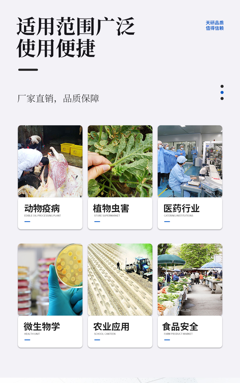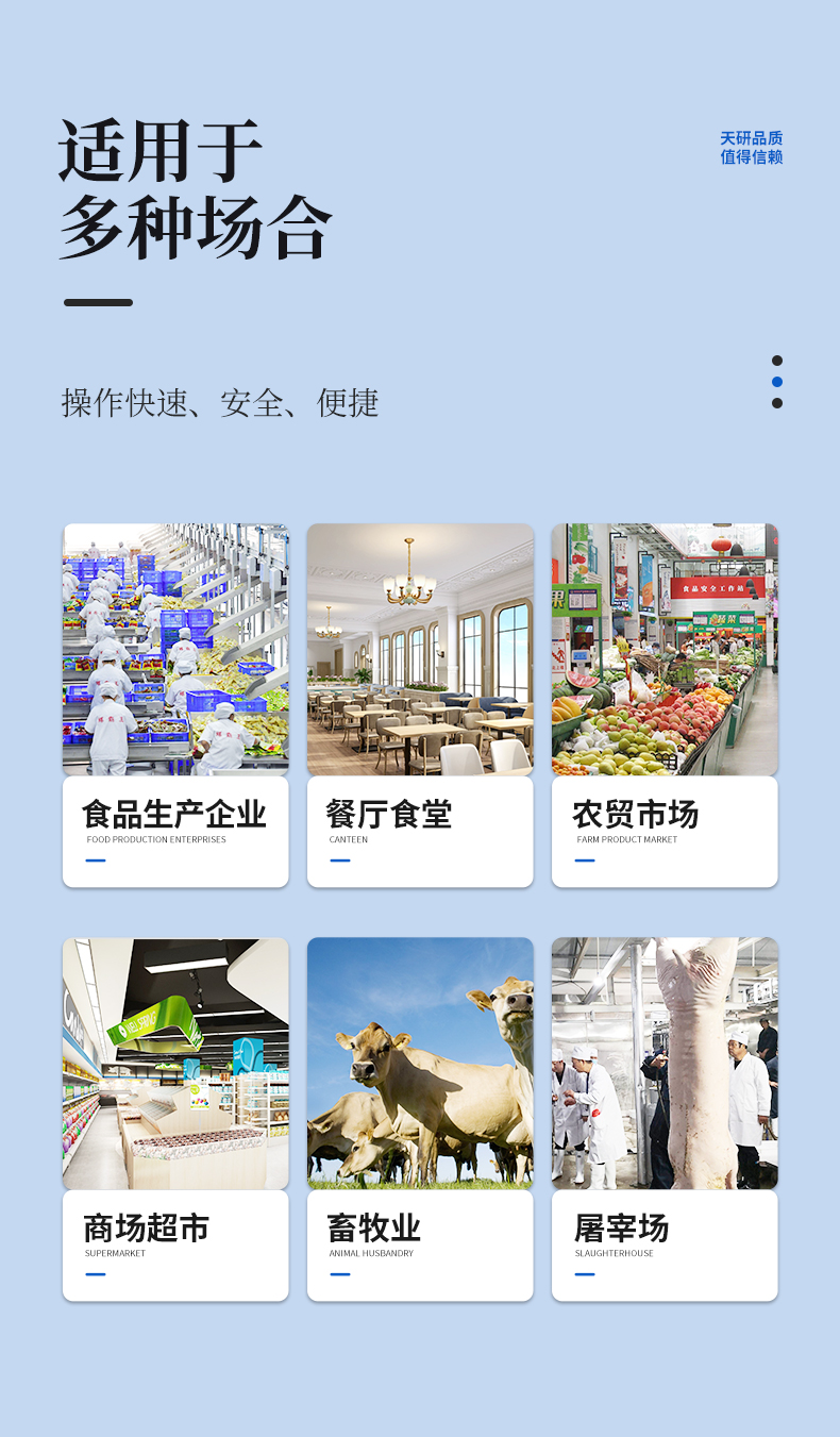 該膠體金檢測(cè)儀適用于豬、雞、鴨、羊、牛、牛奶等畜禽肉產(chǎn)品中獸藥殘留,包括抗生素類(lèi)殘留、瘦肉精激素類(lèi)殘留和水產(chǎn)品有毒有害物質(zhì)的現(xiàn)場(chǎng)快速篩查定及性定量檢測(cè)。 該多功能獸藥殘留檢測(cè)儀為集成化肉品安全快速檢測(cè)分析設(shè)備,可廣泛應(yīng)用于畜牧養(yǎng)殖場(chǎng)、屠宰場(chǎng)、食品肉產(chǎn)品深加工企業(yè)、食藥監(jiān)局、檢驗(yàn)檢疫部門(mén)、衛(wèi)生部門(mén)、高教院校、科研院所、農(nóng)業(yè)部門(mén)等單位使用。