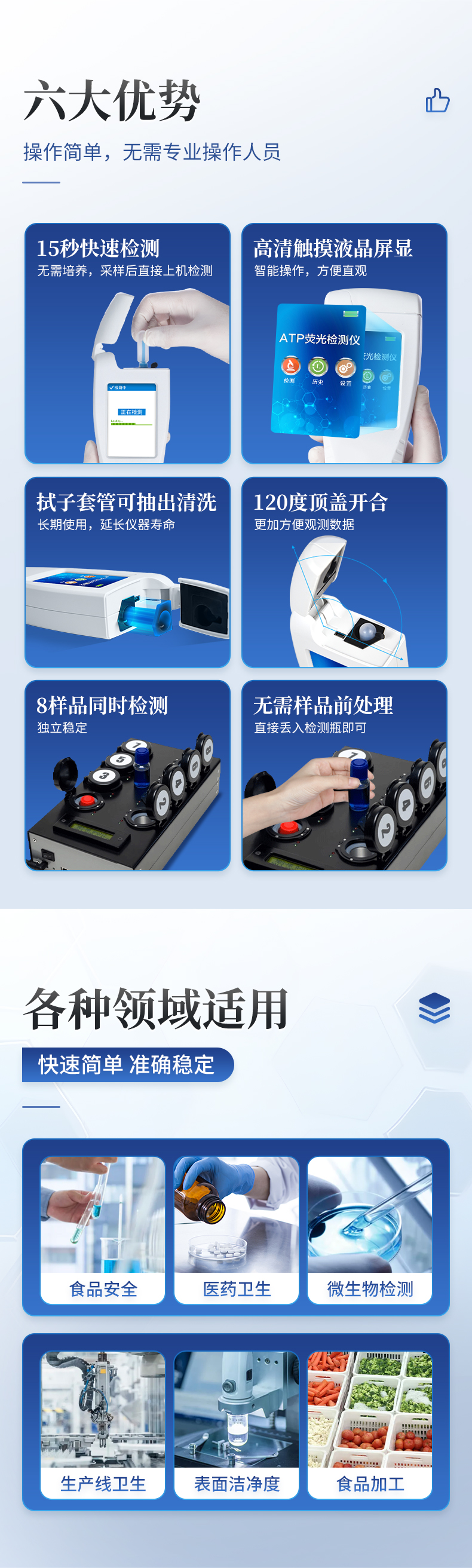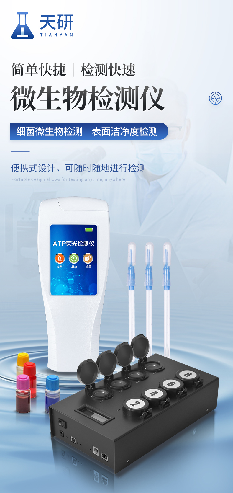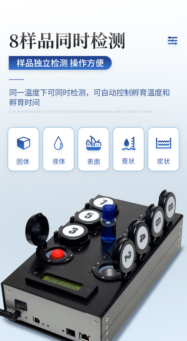 | 可實(shí)現(xiàn)活菌總數(shù)、嗜常溫菌總數(shù)(22℃)、嗜常溫菌總數(shù)(30℃)、大腸桿菌O157:H7、大腸菌群、沙門氏菌、單核增生李斯特菌、金黃色葡萄球菌、阪崎腸桿菌、腸球菌、乳桿菌、酵母菌、真菌、副溶血性弧菌等微生物快速檢測(cè); | 檢測(cè)原理:融合定性培養(yǎng)、代謝物顯色技術(shù)、顏色實(shí)時(shí)監(jiān)測(cè)傳感技術(shù)與一體; | 技術(shù)優(yōu)勢(shì):樣品無(wú)需前處理、無(wú)需提取,即可直接檢測(cè); | 傳感器:三色(或以上)顏色傳感器; | 內(nèi)置3組模塊,每個(gè)模塊獨(dú)立控溫:溫度范圍:15~65℃,控溫精度:±1℃ ; | 共18個(gè)檢測(cè)通道,可同時(shí)檢測(cè)18個(gè)樣品,每個(gè)通道均可檢測(cè)任意項(xiàng)目; | 系統(tǒng)運(yùn)行環(huán)境:安卓/windows; | 箱體:便攜一體式手提箱設(shè)計(jì),自帶手柄方便攜帶,防水、抗壓、抗震; | 顯示:≥10寸電容式液晶觸摸屏; | 打印機(jī):內(nèi)置熱敏打印機(jī),支持背膠打印紙; | 通訊方式:wifi模塊、藍(lán)牙模塊等多種通訊方式; | 運(yùn)行內(nèi)存:≥2GB; | 存儲(chǔ)空間:≥32G; | 系統(tǒng)重量 ≤ 8kg | 工作電源:自帶安全穩(wěn)定的電源適配器,內(nèi)置可充電式備用鋰電池,市電斷電后自動(dòng)報(bào)警,并可維持正常工作半小時(shí)以上; | 具光波防護(hù)安全裝置,操作中如果翻蓋則自動(dòng)暫停分析; | 操作簡(jiǎn)捷:整個(gè)過(guò)程在一個(gè)單次用量分裝的預(yù)制反應(yīng)瓶中即可完成,僅需加樣操作,無(wú)需其他任何移液操作,也無(wú)需前處理; |