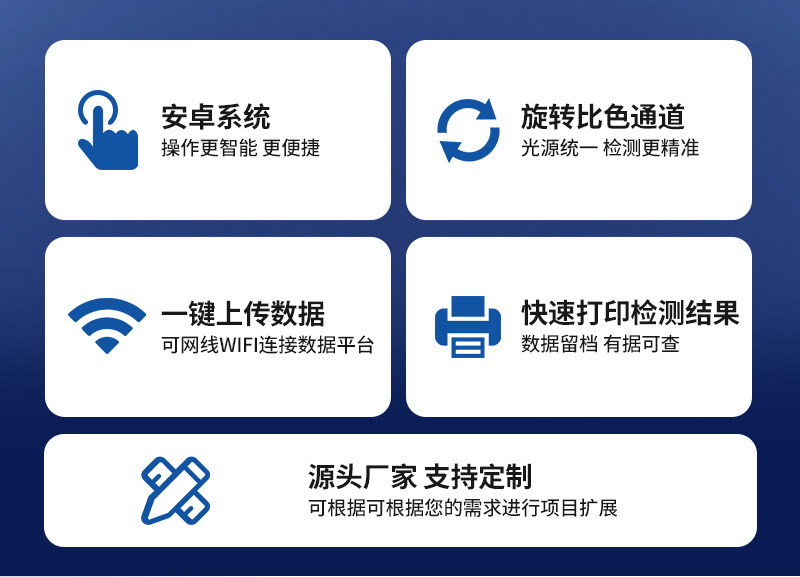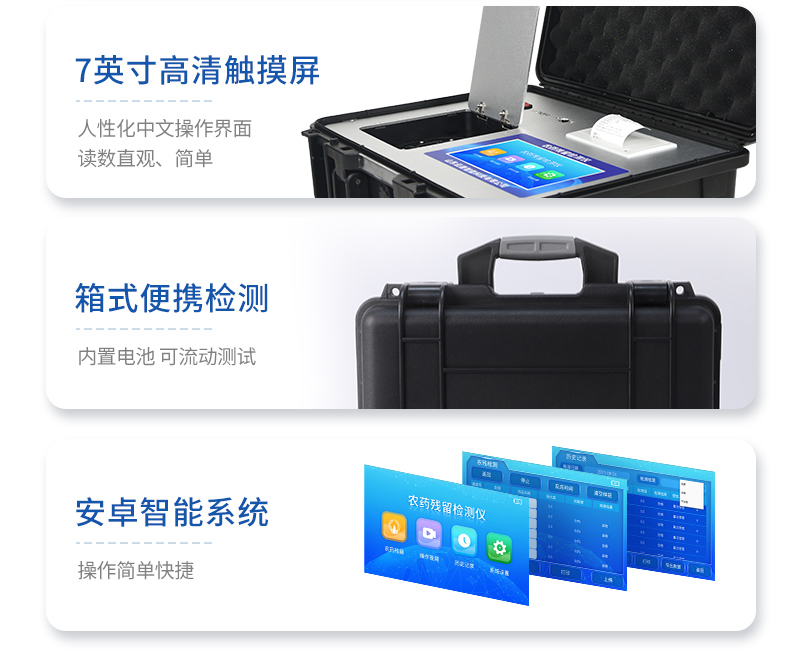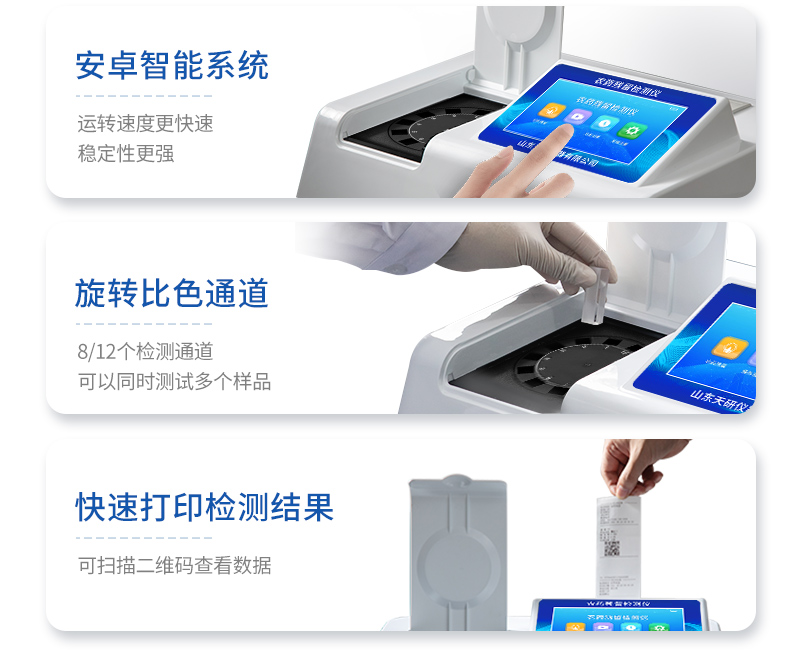 | 儀器采用臺式一體化系統(tǒng)檢測技術(shù),新型農(nóng)殘檢測模塊、數(shù)字化管理模塊、無線通訊模塊高度集成于一體,同時預(yù)留升級檢測方法。 | 儀器檢測模塊標(biāo)準(zhǔn)化、智能化,可隨意自由組合。檢測箱體內(nèi)置多個標(biāo)準(zhǔn)檢測單元,檢測模塊可以調(diào)整配置。 | 儀器采用全新安卓智能系統(tǒng),主控芯片采用 ARM Cortex-A7,RK3288/4核處理器,10.1寸高清液晶觸摸豎屏,更加**的UI交互界面,運轉(zhuǎn)快捷;儀器配備無線通信模塊: 4G(APN)通訊模塊、Wifi模塊,藍牙傳輸,同時具有雙USB接口以及RJ45接口能以多種方式實現(xiàn)數(shù)據(jù)保存和數(shù)據(jù)傳輸功能。 | 創(chuàng)新檢測模式:檢測通道:≥24通道;采用精密旋轉(zhuǎn)比色池設(shè)計,使用同芯片同光源校準(zhǔn)精度,解決不同光源之間的誤差值。1-12通道間誤差0.1%。(**號:ZL202022821055.2) 儀器具有自動識別比色皿檢測功能,即:將樣品比色皿放入儀器后,點擊樣品檢測,儀器自動識別比色皿進行通道檢測。 | 進口高精光源:高精度進口四波長冷光源,通道配置 410、520、590、630nm 波長光源,一個光源芯片驅(qū)動一個光源,誤差極小,每臺設(shè)備單獨**校準(zhǔn)光源,**比對,同時參照四種不同波段光源全方位覆蓋市面上99%的農(nóng)殘食品項目檢測,可按照實際需求進行食品項目檢測升級。 | 高精光源系統(tǒng): ①儀器光源采用進口超高亮發(fā)光二極管,光源亮度可以自動調(diào)節(jié)與校準(zhǔn) ②智能恒流穩(wěn)壓,光強自動校準(zhǔn),長時間連續(xù)工作光源無溫漂現(xiàn)象。 | 智能操作分析系統(tǒng): | 便捷操作系統(tǒng):設(shè)備檢測時可在同一檢測界面自動對應(yīng)相關(guān)檢測通道一次性選擇1-24個樣品名稱,無須退出界面,節(jié)省操作時間。 | 數(shù)據(jù)集成系統(tǒng):設(shè)備首頁自動統(tǒng)計檢測數(shù)據(jù)包含:周檢測數(shù)據(jù)、月檢測數(shù)據(jù),全部檢測總數(shù)量,均包含檢測總數(shù),合格數(shù),不合格數(shù),以及相關(guān)柱形分析圖,對各項檢測數(shù)據(jù)清晰掌握,無需電腦查詢,更加快捷直觀。 | 項目預(yù)設(shè)系統(tǒng):支持添加單個及多個相同或不相同的任務(wù)預(yù)設(shè),一鍵快速調(diào)取,每一個任務(wù)分別可以設(shè)置不同的樣品、批次、編號、來源、備注、抽樣信息、檢測信息、受檢信息、復(fù)核信息等更多信息。 | 數(shù)據(jù)監(jiān)管系統(tǒng):同步對接監(jiān)管平臺,數(shù)據(jù)可局域網(wǎng)和互聯(lián)網(wǎng)數(shù)據(jù)上傳,檢測結(jié)果可選擇直接傳至食品安全監(jiān)管平臺。集成OSS輸出存儲服務(wù)、區(qū)分設(shè)備定向管理應(yīng)用,進行區(qū)域食品安全監(jiān)管及大數(shù)據(jù)分析處理與數(shù)據(jù)統(tǒng)計,檢測區(qū)域食品安全長短期動態(tài),達到食品安全問題預(yù)估、預(yù)警。 | 自定義打印系統(tǒng):內(nèi)置新創(chuàng)自定義打印系統(tǒng),可按需靈活設(shè)置開啟或關(guān)閉:產(chǎn)品合格證(國家農(nóng)業(yè)部標(biāo)準(zhǔn)),二維碼,抽樣信息、檢測信息,受檢信息、復(fù)核信息、抽樣日期、檢測日期等信息的打印。 | A4版本報告打印功能:設(shè)備可自動生成A4版報告,外接打印機即可打印 | 系統(tǒng)遠程更新功能:可定向分客戶分儀器更新系統(tǒng),按照不同客戶后期實際需求添加項目,無需設(shè)備返廠,即可遠程實時升級全新系統(tǒng),節(jié)省時間成本及避免運輸造成設(shè)備損壞。 | 安全證書,放心保障:儀器具有中國計量科學(xué)研究院校準(zhǔn)證書,**認(rèn)證。 |