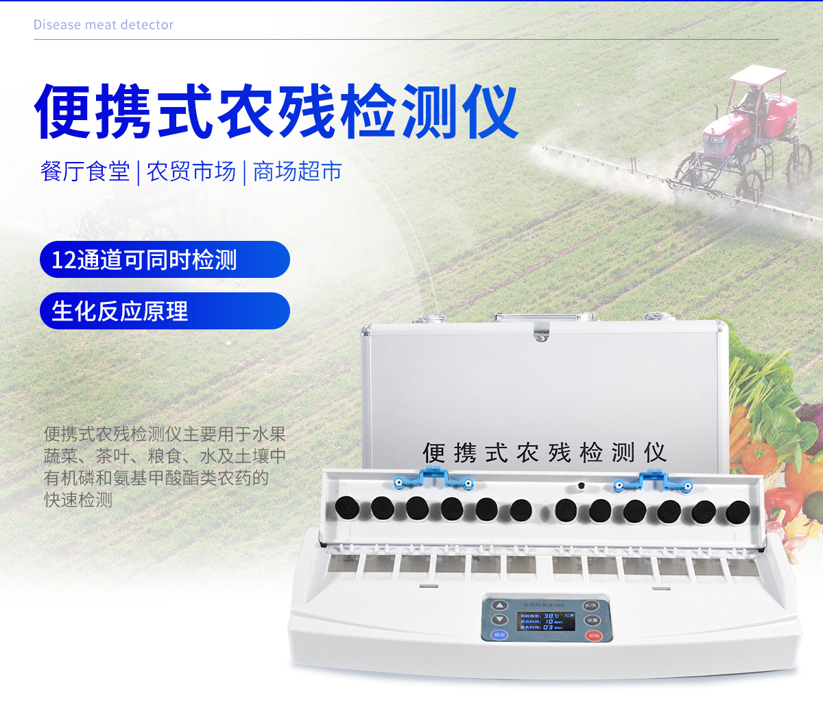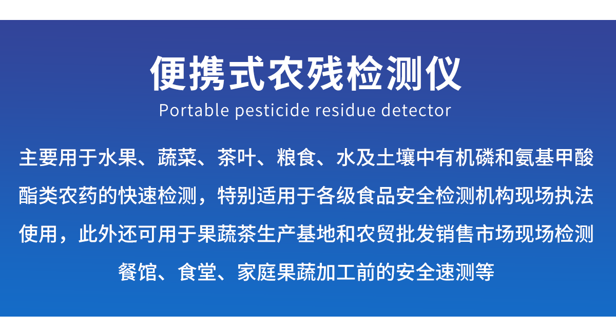 主要用于水果、蔬菜、茶葉、糧食、水及土壤中有機磷和氨基甲酸酯類農(nóng)藥的快速檢測,特別適用于各級食品安全檢測機構(gòu)現(xiàn)場執(zhí)法使用,此外還可用于果蔬茶生產(chǎn)基地和農(nóng)貿(mào)批發(fā)銷售市場現(xiàn)場檢測,餐館、食堂、家庭果蔬加工前的安全速測等