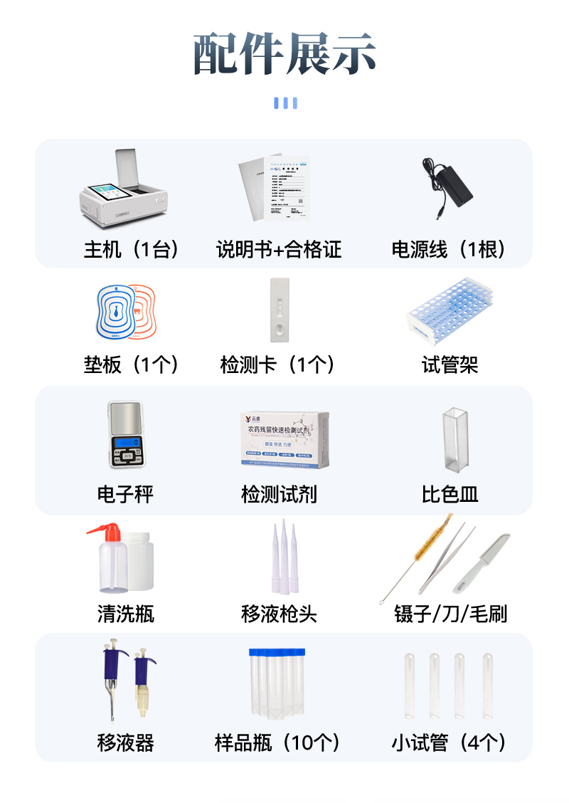 | 儀器采用臺(tái)式一體化系統(tǒng)檢測(cè)技術(shù),將分光光度模塊、新型農(nóng)殘檢測(cè)模塊、數(shù)字化管理模塊、無線通訊模塊高度集成于一體,支持檢測(cè)200種食品安全檢測(cè)項(xiàng)目,同時(shí)預(yù)留升級(jí)檢測(cè)方法。 | 儀器檢測(cè)模塊標(biāo)準(zhǔn)化、智能化,可隨意自由組合。檢測(cè)箱體內(nèi)置多個(gè)標(biāo)準(zhǔn)檢測(cè)單元,檢測(cè)模塊可以調(diào)整配置。 | 儀器采用全新安卓智能系統(tǒng),主控芯片采用 ARM Cortex-A7,RK3288/4核處理器,10.1寸高清液晶觸摸豎屏,更加**的UI交互界面,運(yùn)轉(zhuǎn)快捷;儀器配備無線通信模塊: 4G(APN)通訊模塊、Wifi模塊,藍(lán)牙傳輸,同時(shí)具有雙USB接口以及RJ45接口能以多種方式實(shí)現(xiàn)數(shù)據(jù)保存和數(shù)據(jù)傳輸功能。 | 創(chuàng)新檢測(cè)模式: | ★檢測(cè)通道:≥12通道;采用精密旋轉(zhuǎn)比色池設(shè)計(jì),使用同芯片同光源校準(zhǔn)精度,解決不同光源之間的誤差值。1-12通道間誤差0.1%。(**號(hào):ZL202022821055.2) | ★儀器具有自動(dòng)識(shí)別比色皿檢測(cè)功能,即:將樣品比色皿放入儀器后,點(diǎn)擊樣品檢測(cè),儀器自動(dòng)識(shí)別比色皿進(jìn)行通道檢測(cè)。 | 進(jìn)口高精光源: | 高精度進(jìn)口四波長冷光源,通道配置 410、520、590、630nm 波長光源,一個(gè)光源芯片驅(qū)動(dòng)一個(gè)光源,誤差極小,每臺(tái)設(shè)備單獨(dú)**校準(zhǔn)光源,**比對(duì),同時(shí)參照四種不同波段光源全方位覆蓋市面上99%的農(nóng)殘食品項(xiàng)目檢測(cè)。 | 智能化操作系統(tǒng): | 便捷操作系統(tǒng):設(shè)備檢測(cè)時(shí)可在同一檢測(cè)界面自動(dòng)對(duì)應(yīng)相關(guān)檢測(cè)通道一次性選擇1-12個(gè)樣品名稱,無須退出界面,節(jié)省操作時(shí)間。 | 數(shù)據(jù)集成系統(tǒng):設(shè)備首頁自動(dòng)統(tǒng)計(jì)檢測(cè)數(shù)據(jù)包含:周檢測(cè)數(shù)據(jù)、月檢測(cè)數(shù)據(jù),全部檢測(cè)總數(shù)量,均包含檢測(cè)總數(shù),合格數(shù),不合格數(shù),以及相關(guān)柱形分析圖,對(duì)各項(xiàng)檢測(cè)數(shù)據(jù)清晰掌握,無需電腦查詢,更加快捷直觀。 | 項(xiàng)目預(yù)設(shè)系統(tǒng):支持添加單個(gè)及多個(gè)相同或不相同的任務(wù)預(yù)設(shè),一鍵快速調(diào)取,每一個(gè)任務(wù)分別可以設(shè)置不同的樣品、批次、編號(hào)、來源、備注、抽樣信息、檢測(cè)信息、受檢信息、復(fù)核信息等更多信息。無縫鏈接平臺(tái)和APP實(shí)時(shí)查看下發(fā)任務(wù)。 | 數(shù)據(jù)監(jiān)管系統(tǒng):同步對(duì)接監(jiān)管平臺(tái),數(shù)據(jù)可局域網(wǎng)和互聯(lián)網(wǎng)數(shù)據(jù)上傳,檢測(cè)結(jié)果可選擇直接傳至食品安全監(jiān)管平臺(tái)。集成OSS輸出存儲(chǔ)服務(wù)、區(qū)分設(shè)備定向管理應(yīng)用,進(jìn)行區(qū)域食品安全監(jiān)管及大數(shù)據(jù)分析處理與數(shù)據(jù)統(tǒng)計(jì),檢測(cè)區(qū)域食品安全長短期動(dòng)態(tài),達(dá)到食品安全問題預(yù)估、預(yù)警。 | 自定義打印系統(tǒng):內(nèi)置全新打印系統(tǒng),新創(chuàng)自定義打印方式,可按需靈活設(shè)置開啟或關(guān)閉:產(chǎn)品合格證(國家農(nóng)業(yè)部標(biāo)準(zhǔn)要求),二維碼,抽樣信息、檢測(cè)信息,受檢信息、復(fù)核信息、抽樣日期、檢測(cè)日期等信息的打印。 | 系統(tǒng)遠(yuǎn)程更新功能:可定向分客戶分儀器更新系統(tǒng),按照不同客戶后期實(shí)際需求添加項(xiàng)目,無需機(jī)器返廠,即可遠(yuǎn)程實(shí)時(shí)升級(jí)全新系統(tǒng),節(jié)省時(shí)間成本及避免運(yùn)輸造成設(shè)備損壞。 | 儀器主機(jī)采用一體化防水、抗壓、防撞擊、防腐蝕箱體設(shè)計(jì),同時(shí)配備交直流供電,可連接車載電源,可選配大容量充電鋰電池,滿足現(xiàn)場野外檢測(cè)需求。 | 安全證書,放心保障:儀器具有中國計(jì)量科學(xué)研究院校準(zhǔn)證書,**認(rèn)證。 |