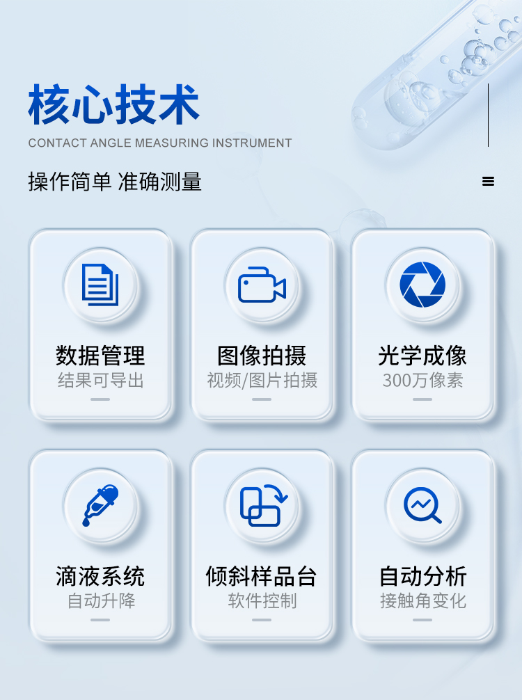 本機(jī)除了利用停滴法測(cè)試靜態(tài)接觸角外,更側(cè)重于利用傾斜板法測(cè)試和分析動(dòng)態(tài)接觸角(包括前進(jìn)接觸角、后退接觸角和滾動(dòng)角);同時(shí)也可以測(cè)試液體表面張力、估算固體表面能和分析潤(rùn)濕性。廣泛應(yīng)用于生物化工、納米技術(shù)、涂層工藝、耐水材料、科教軍工等尖端領(lǐng)域的測(cè)試與研究。