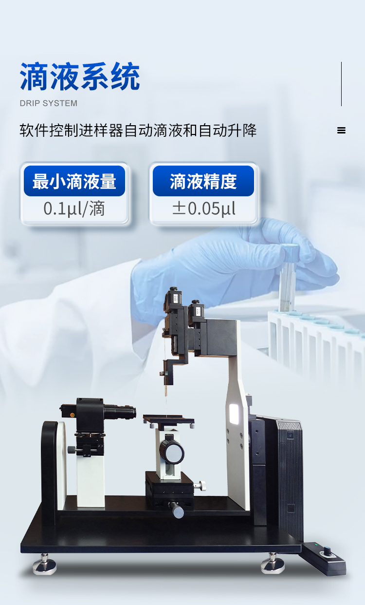 | 1.動(dòng)/靜態(tài)接觸角測(cè)量 | 1-1.分析算法:量高法、量角法、圓環(huán)法、橢圓法、切線法、Y-L法 1-2.具有左接觸角、右接觸角和平均接觸角分開測(cè)試和比較功能 11-3.具有凹面、凸面、弧面、超親水、超疏水等特殊表面分析功能 11-4.具有不規(guī)則形、非軸對(duì)稱本征接觸角的分析功能 11-5.具有前進(jìn)接觸角、后退接觸角及滾動(dòng)角的分析功能 11-6.具有自動(dòng)分析接觸角變化過(guò)程的批處理測(cè)試功能 11-7.測(cè)量范圍:0°~180° 11-8.測(cè)量精度:±0.1° 11-9.提供標(biāo)定塊,可隨時(shí)對(duì)測(cè)量精度進(jìn)行校準(zhǔn) 11-10.測(cè)量分辨率:0.001° | 2.表面/界面張力測(cè)量 | 2-1.分析算法:手動(dòng)法、自動(dòng)法 2-2.測(cè)量范圍:0.01~2000mN/m 2-3.測(cè)量精度:±0.1% 2-4.測(cè)量分辨率:0.001mN/m | 3.表面能估算 | 3-1.估算模型:Fowkes、擴(kuò)展Fowkes、Owens-Wendt、van OSS、Wu調(diào)和平均法、狀態(tài)方程法3-2.可分別得到固體表面能、色散力、極性力、氫鍵力、范德華分量、路易斯酸分量、路易斯堿分量等 3-3.液體數(shù)據(jù)庫(kù):預(yù)置37種常用液體表面張力及其分量數(shù)據(jù),數(shù)據(jù)可直接調(diào)入用于表面能估算 3-4.液體庫(kù)數(shù)據(jù)可自行添加、刪除和修改 | 4.潤(rùn)濕性分析 | 4-1.通過(guò)液體的表面張力和對(duì)固體的接觸角可分析該固體的潤(rùn)濕程度,包括粘附功、鋪展系數(shù)和粘附張力 | 5.?dāng)?shù)據(jù)管理 | 5-1.通過(guò)試驗(yàn)?zāi)0灞4嬖囼?yàn)信息、試驗(yàn)數(shù)據(jù)和圖片 35-2.新建的試驗(yàn)?zāi)0灞4婧罂芍貜?fù)調(diào)入使用 35-3.可對(duì)試驗(yàn)數(shù)據(jù)進(jìn)行修改、刪除和調(diào)入再分析等 35-4.試驗(yàn)數(shù)據(jù)可標(biāo)注于圖片上,并隨圖片一起保存 35-5.試驗(yàn)結(jié)果可導(dǎo)出至Word、Excel和PDF | 6.圖像拍攝 | 6-1.單張拍攝、連續(xù)拍攝、視頻錄制和圖片回放 6-2.可選擇采用相機(jī)外觖發(fā)功能自動(dòng)拍攝 | 7.光學(xué)成像系統(tǒng) | 7-1.相機(jī):300萬(wàn)像素、幀率200幀/秒 7-2.鏡頭:0.6~4.0×連續(xù)變倍、工作距離82mm 7-3.調(diào)焦范圍:±12.5mm;調(diào)焦精度:0.25mm 7-4.調(diào)焦時(shí)軟件自動(dòng)檢測(cè)清晰度,消除人為誤差 7-5.水平和俯仰調(diào)整范圍:±2° 7-6.背光源:LED冷光源+遮光板,亮度無(wú)極調(diào)節(jié) | 8.滴液系統(tǒng) | 8-1.滴液方式:軟件控制進(jìn)樣器自動(dòng)滴液和自動(dòng)升降 8-2.*小滴液量:0.1μl/滴8-3.滴液精度:±0.05μl | 9.傾斜樣品臺(tái) | 9-1.臺(tái)面尺寸:X100×Y90mm 9-2.移動(dòng)行程:X50×Y50×Z50mm 9-3.移動(dòng)方式:手動(dòng)旋鈕控制三維移動(dòng)定位 9-4.傾斜方式:軟件控制樣品臺(tái)、成像系統(tǒng)和滴液系統(tǒng)同軸整體傾斜 9-5.傾斜過(guò)程中液滴始終位于視窗中心,無(wú)需人為調(diào)整樣品臺(tái)位置 9-6.傾斜范圍:0°~±90° 9-7.傾斜精度:±0.01° | 10.主機(jī)參數(shù) | 10-1.尺寸:約W585×D280×H650mm 10-2.重量:約25kg 10-3.電源:1∮ AC220V 50HZ |