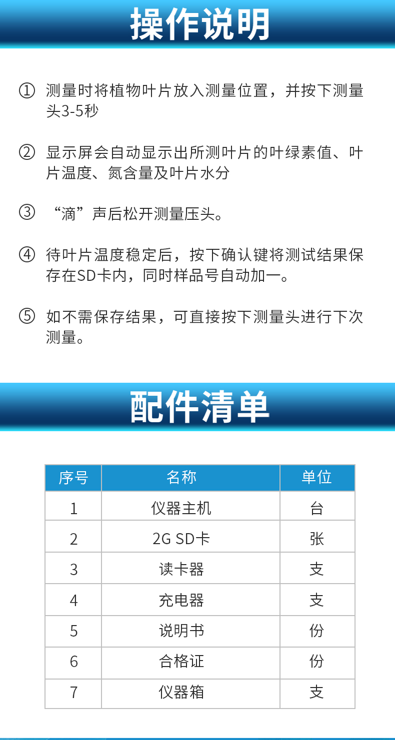 | 測量范圍 0.0-99.9 SPAD | 測量面積 2mm*2mm | 測量精度 ±1.0 SPAD單位以內(nèi) (室溫下,SPAD值介乎0-50) | 重復(fù)性 ±0.3 SPAD單位以內(nèi) (SPAD值介乎0-50) | 測量時間間隔 小于3秒 | 數(shù)據(jù)存儲容量 2GB | 電源 4.2V可充電鋰電池 | 電池容量 800mah | 重量 250g | 外形尺寸 140×85×45mm(長×寬×高) | 工作及存儲環(huán)境 0℃-50℃;85%相對濕度 |
