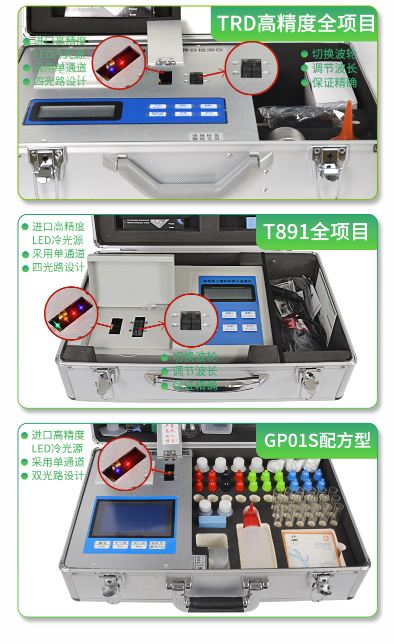 | 配套齊全:該儀器集藥、器、儀為一體,攜帶方便,相當(dāng)于一個(gè)小型實(shí)驗(yàn)室。適于農(nóng)業(yè)服務(wù)部門(mén)或農(nóng)資經(jīng)銷商、肥料廠商測(cè)土施肥和鑒別肥料真假。 | 操作簡(jiǎn)便、速度快捷,成品藥劑開(kāi)瓶即用,無(wú)須配置。 | 性能可靠:工作穩(wěn)定性優(yōu)于國(guó)家標(biāo)準(zhǔn)JJG179-90指標(biāo)的6倍,重復(fù)性達(dá)到光柵型分光光度計(jì)指標(biāo)水平。 |