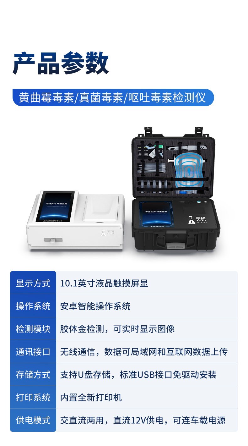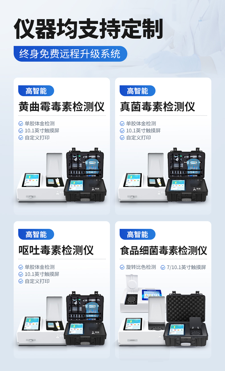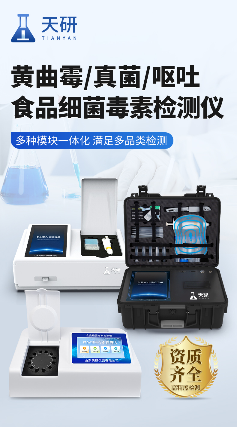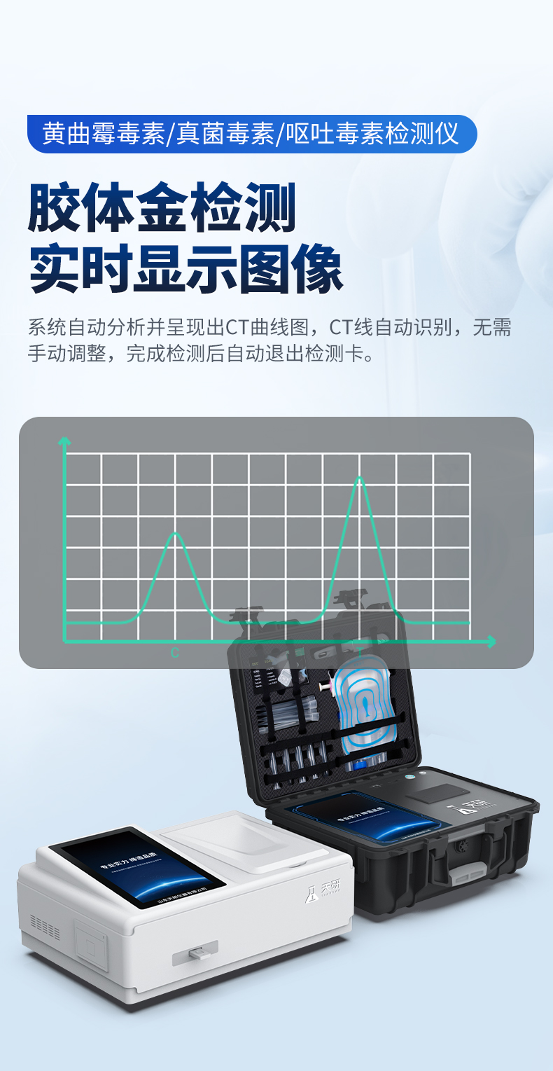 山東天研儀器有限公司生產(chǎn)的真菌毒素檢測儀應用競爭抑制免疫層析的技術原理,通過就是通過待檢測物與抗體結(jié)合的方法,分析待檢樣品中真菌毒素殘留??煽焖贆z測糧食、飼料、谷物、食用油、調(diào)味品中如玉米、大米、小麥、大麥、糙米、麩皮、稻谷、豆粕、米糠、飼料中的黃曲霉毒素B1、M1、總量,玉米赤霉烯酮、嘔吐毒素、T2毒素、赭曲霉毒素、伏馬毒素等