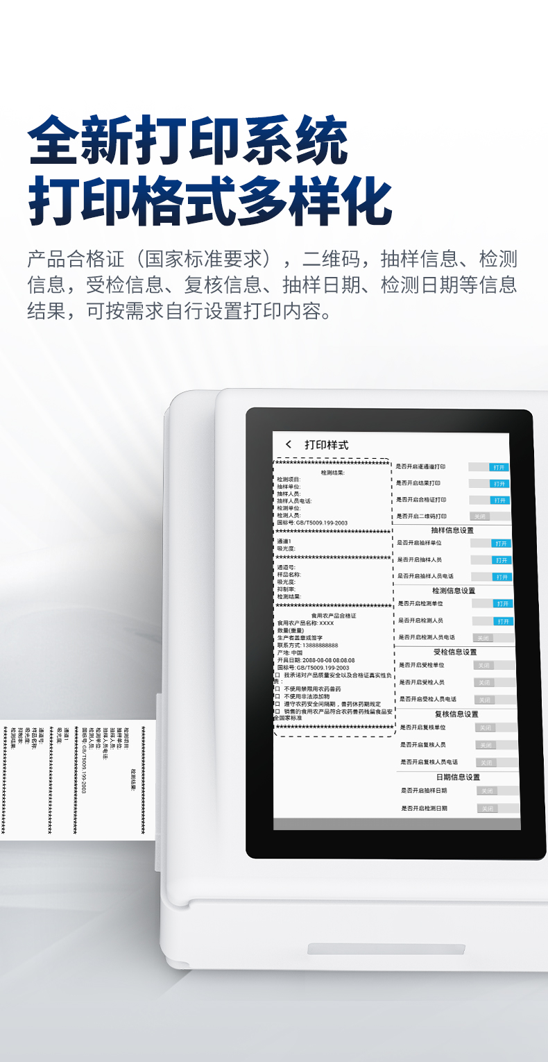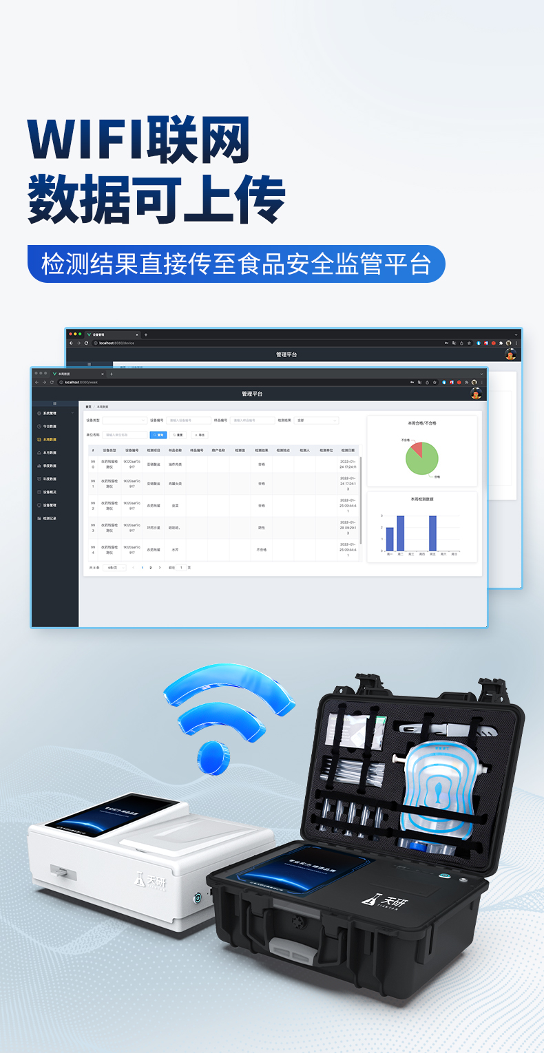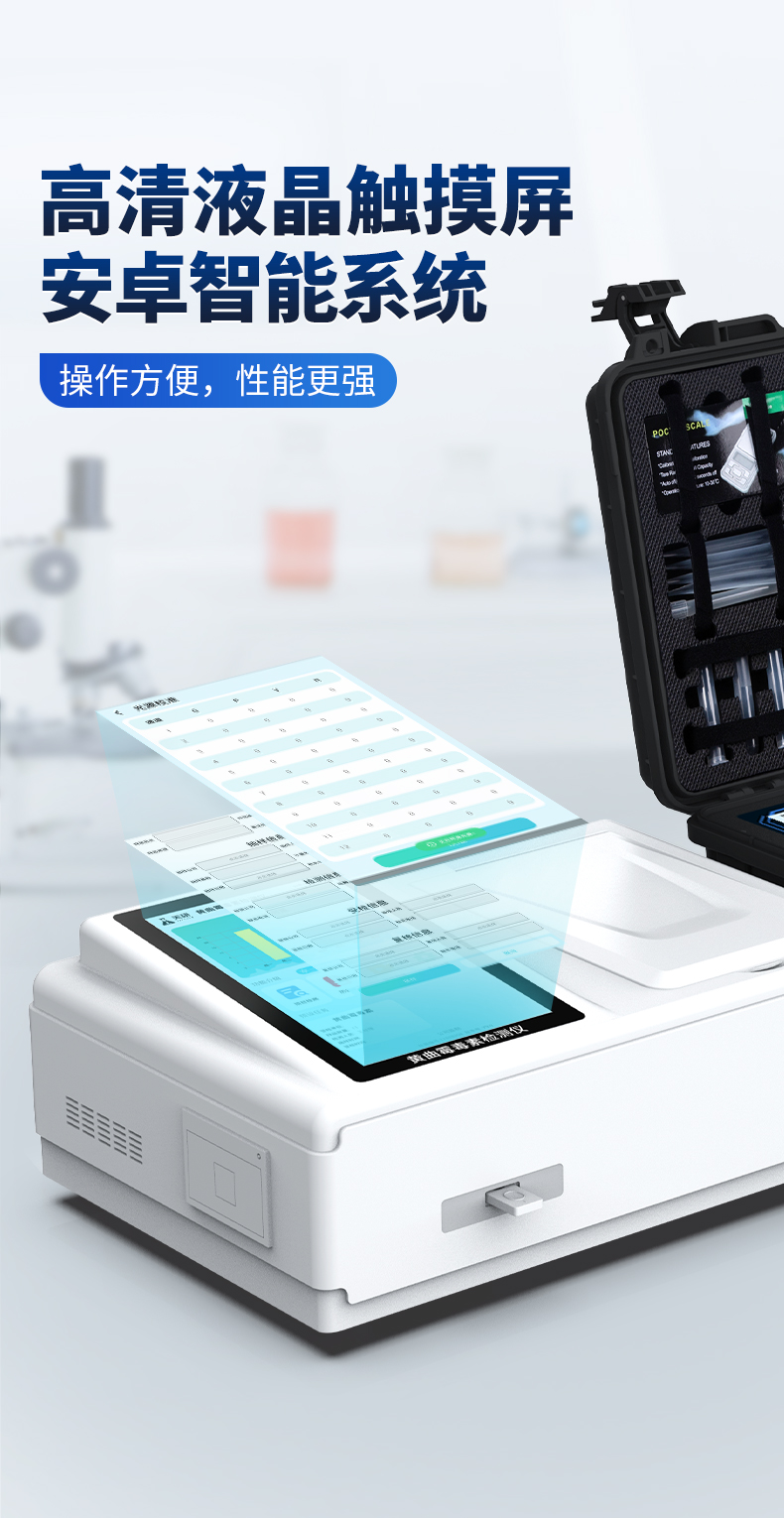 | 1、儀器采用10.1英寸液晶觸摸屏顯,搭配運行安卓智能操作系統(tǒng),主控芯片采用ARM Cortex-A7,RK3288/4核處理器,主頻1.88Ghz,運轉(zhuǎn)速度更快速,性能更強。 | 2、儀器功能包括:膠體金檢測模塊、數(shù)字化管理模塊、無線通訊模塊等,可以滿足同一軟件下實現(xiàn)所有檢測項目的檢測,并在同一窗口展示檢測結(jié)果。 | 3.一體化臺式快檢設備,采用交直流兩用供電方式,可連接車載電源,配備6ah大容量充電鋰電池,可以滿足現(xiàn)場及流動檢測使用的需求。儀器尺寸:43×35×20cm, 主機凈重:5.1kg | 4、系統(tǒng)自帶數(shù)據(jù)集成模塊,設備首頁自動統(tǒng)計檢測數(shù)據(jù)包含:周檢測數(shù)據(jù)、月檢測數(shù)據(jù),全部檢測總數(shù)量,均包含檢測總數(shù),合格數(shù),不合格數(shù),以及相關柱形分析圖,對各項檢測數(shù)據(jù)清晰掌握,無需電腦查詢,更加快捷直觀。 | 5、儀器具有任務預設模塊,可在樣品送檢前提前預設樣品名稱、檢測指標、送檢單位等信息,樣品送檢時一鍵調(diào)取保存信息,檢測更加方便快捷。 | 6、膠體金檢測模塊: | 直插式自動掃描方式,可實時顯示金標卡實時圖像,系統(tǒng)自動分析并呈現(xiàn)出CT曲線圖,CT線自動識別,無需手動調(diào)整,完成檢測后自動退出檢測卡。 | 結(jié)果判定線可修改,對照值標定值可保存,斷電不丟失數(shù)據(jù)。 | 兼容市場上其他膠體金卡,使用耗材不受限制,極大增強用戶使用體驗。 | 7、儀器檢測系統(tǒng)擁有龐大數(shù)據(jù)庫,并且構建了完善的檢索、修訂功能。食品庫涵蓋多種樣品名稱,可按需添加或刪除、編輯樣品名稱;產(chǎn)品數(shù)據(jù)庫以及歷史檢測記錄支持一鍵檢索功能。 | 8、系統(tǒng)打印自定義化,打印格式多樣化,產(chǎn)品合格證(國家標準要求),二維碼,抽樣信息、檢測信息,受檢信息、復核信息、抽樣日期、檢測日期等信息結(jié)果,可按需求自行設置打印內(nèi)容。 | 9、A4紙版本報告打印功能(可選配):設備擁有兩種結(jié)果展示方式,可以自動生成A4打印模板和小票打印模板兩種樣式,可通過WiFi及網(wǎng)線等方式鏈接外置打印機可進行打印 | 10、儀器具有 wifi 聯(lián)網(wǎng)上傳、RJ45網(wǎng)線連接功能,可以快速上傳數(shù)據(jù)。同步對接監(jiān)管平臺,數(shù)據(jù)可局域網(wǎng)和互聯(lián)網(wǎng)數(shù)據(jù)上傳,檢測結(jié)果直接傳至食品安全監(jiān)管平臺。進行區(qū)域食品安全監(jiān)管及大數(shù)據(jù)分析處理與數(shù)據(jù)統(tǒng)計,檢測區(qū)域食品安全長短期動態(tài),達到食品安全問題預估、預警。 | 11、設備支持U盤存儲,標準USB接口,免驅(qū)動安裝。檢測結(jié)果存儲容量20萬條以上,可生成Excel表格,進行一鍵拷貝,并具有登錄保護功能,可設置用戶名及密碼,規(guī)范不同人員操作權限,防止非工作人員操作,并且可以進行重新校準、鎖定、恢復出廠設置功能。儀器固件可升級,后期檢測項目可擴充。 | 12、儀器具備遠程升級功能,可定向分客戶分儀器更新,開機后自動更新,并可持續(xù)性免費更新系統(tǒng)版本,無需像傳統(tǒng)產(chǎn)品返廠更新,節(jié)省時間及人力成本并避免了物流運輸返廠升級導致設備損壞的潛在風險。 |