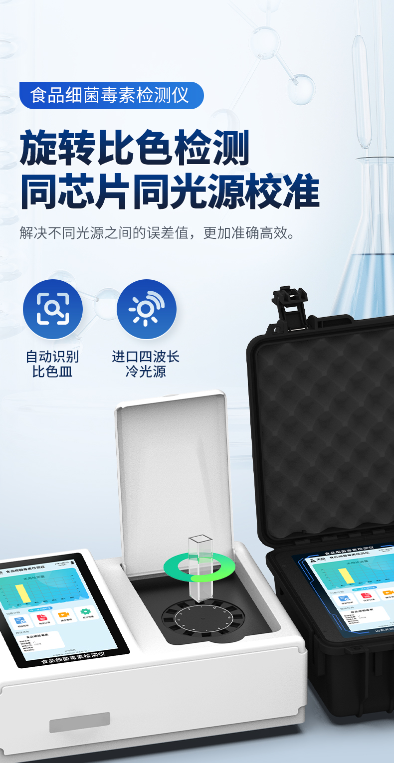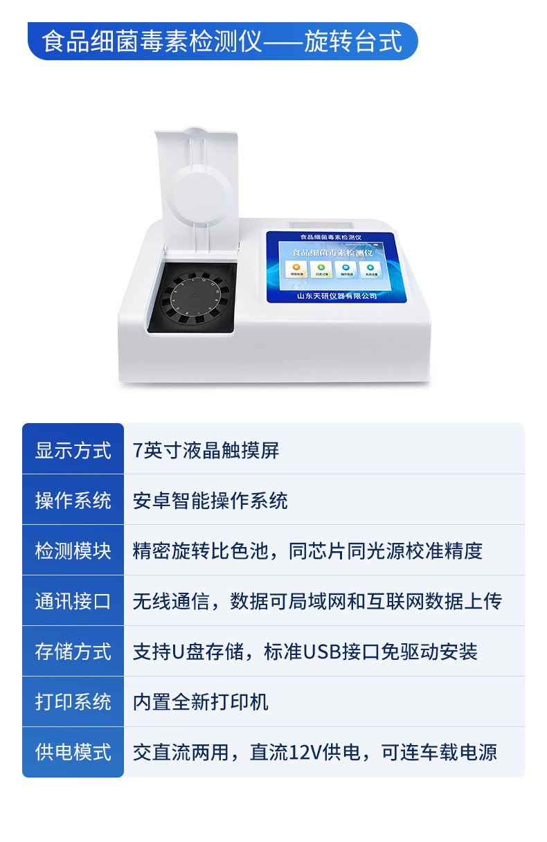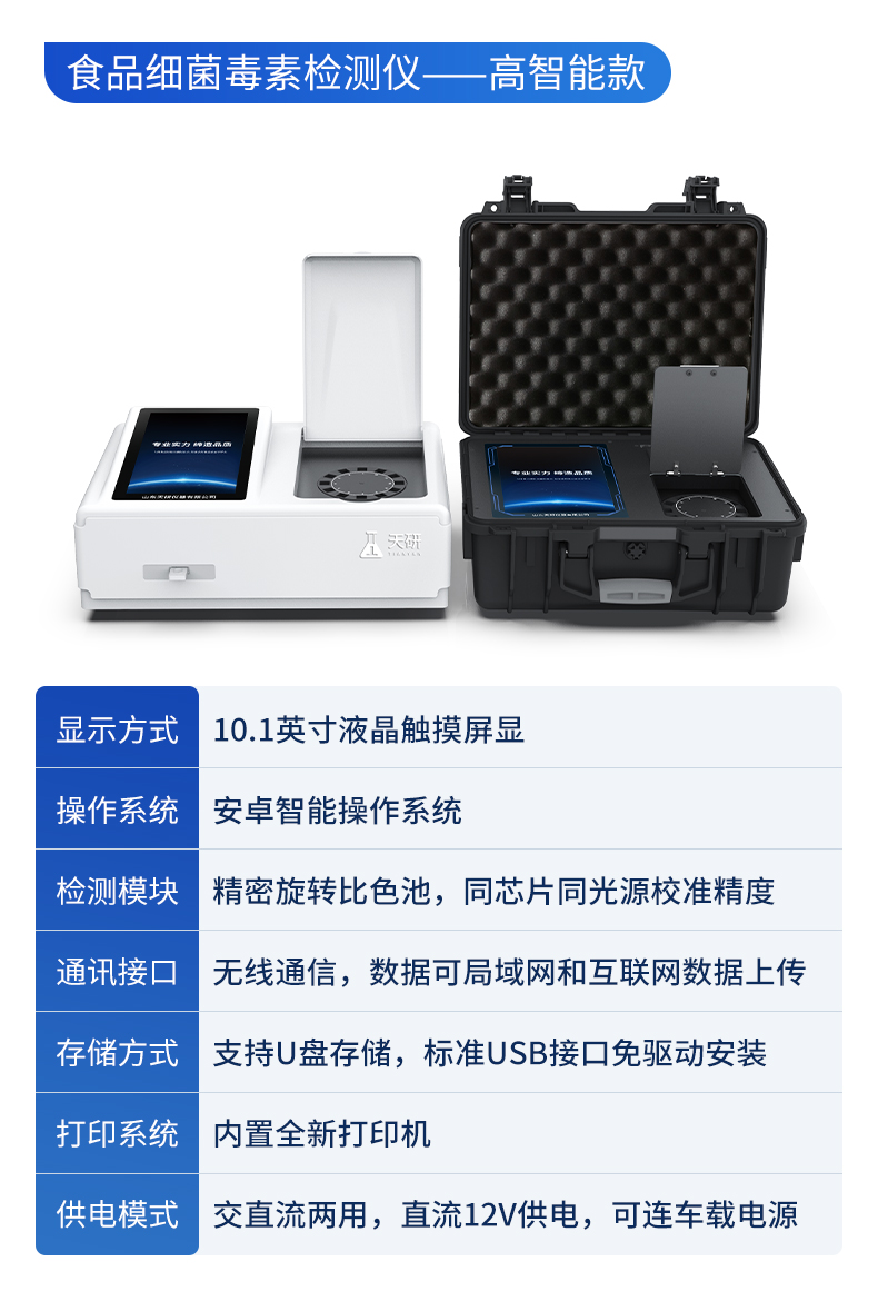 | 1、儀器采用10.1英寸液晶觸摸屏顯,搭配運行安卓智能操作系統(tǒng),主控芯片采用ARM Cortex-A7,RK3288/4核處理器,主頻1.88Ghz,運轉(zhuǎn)速度更快速,性能更強。 | 2、儀器功能包括:膠體金檢測模塊、數(shù)字化管理模塊、無線通訊模塊等,可以滿足同一軟件下實現(xiàn)所有檢測項目的檢測,并在同一窗口展示檢測結(jié)果。 | 3.一體化臺式快檢設備,采用交直流兩用供電方式,可連接車載電源,配備6ah大容量充電鋰電池,可以滿足現(xiàn)場及流動檢測使用的需求。儀器尺寸:43×35×20cm, 主機凈重:5.1kg | 4、系統(tǒng)自帶數(shù)據(jù)集成模塊,設備首頁自動統(tǒng)計檢測數(shù)據(jù)包含:周檢測數(shù)據(jù)、月檢測數(shù)據(jù),全部檢測總數(shù)量,均包含檢測總數(shù),合格數(shù),不合格數(shù),以及相關柱形分析圖,對各項檢測數(shù)據(jù)清晰掌握,無需電腦查詢,更加快捷直觀。 | 5、儀器具有任務預設模塊,可在樣品送檢前提前預設樣品名稱、檢測指標、送檢單位等信息,樣品送檢時一鍵調(diào)取保存信息,檢測更加方便快捷。 | 6、膠體金檢測模塊: | 直插式自動掃描方式,可實時顯示金標卡實時圖像,系統(tǒng)自動分析并呈現(xiàn)出CT曲線圖,CT線自動識別,無需手動調(diào)整,完成檢測后自動退出檢測卡。 | 結(jié)果判定線可修改,對照值標定值可保存,斷電不丟失數(shù)據(jù)。 | 兼容市場上其他膠體金卡,使用耗材不受限制,極大增強用戶使用體驗。 | 7、儀器檢測系統(tǒng)擁有龐大數(shù)據(jù)庫,并且構建了完善的檢索、修訂功能。食品庫涵蓋多種樣品名稱,可按需添加或刪除、編輯樣品名稱;產(chǎn)品數(shù)據(jù)庫以及歷史檢測記錄支持一鍵檢索功能。 | 8、系統(tǒng)打印自定義化,打印格式多樣化,產(chǎn)品合格證(國家標準要求),二維碼,抽樣信息、檢測信息,受檢信息、復核信息、抽樣日期、檢測日期等信息結(jié)果,可按需求自行設置打印內(nèi)容。 | 9、A4紙版本報告打印功能(可選配):設備擁有兩種結(jié)果展示方式,可以自動生成A4打印模板和小票打印模板兩種樣式,可通過WiFi及網(wǎng)線等方式鏈接外置打印機可進行打印 | 10、儀器具有 wifi 聯(lián)網(wǎng)上傳、RJ45網(wǎng)線連接功能,可以快速上傳數(shù)據(jù)。同步對接監(jiān)管平臺,數(shù)據(jù)可局域網(wǎng)和互聯(lián)網(wǎng)數(shù)據(jù)上傳,檢測結(jié)果直接傳至食品安全監(jiān)管平臺。進行區(qū)域食品安全監(jiān)管及大數(shù)據(jù)分析處理與數(shù)據(jù)統(tǒng)計,檢測區(qū)域食品安全長短期動態(tài),達到食品安全問題預估、預警。 | 11、設備支持U盤存儲,標準USB接口,免驅(qū)動安裝。檢測結(jié)果存儲容量20萬條以上,可生成Excel表格,進行一鍵拷貝,并具有登錄保護功能,可設置用戶名及密碼,規(guī)范不同人員操作權限,防止非工作人員操作,并且可以進行重新校準、鎖定、恢復出廠設置功能。儀器固件可升級,后期檢測項目可擴充。 | 12、儀器具備遠程升級功能,可定向分客戶分儀器更新,開機后自動更新,并可持續(xù)性免費更新系統(tǒng)版本,無需像傳統(tǒng)產(chǎn)品返廠更新,節(jié)省時間及人力成本并避免了物流運輸返廠升級導致設備損壞的潛在風險。 |