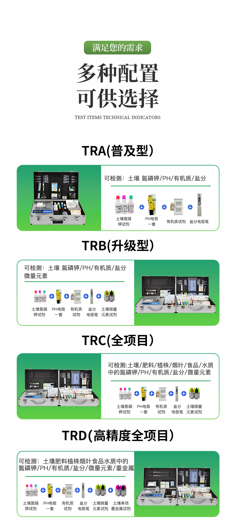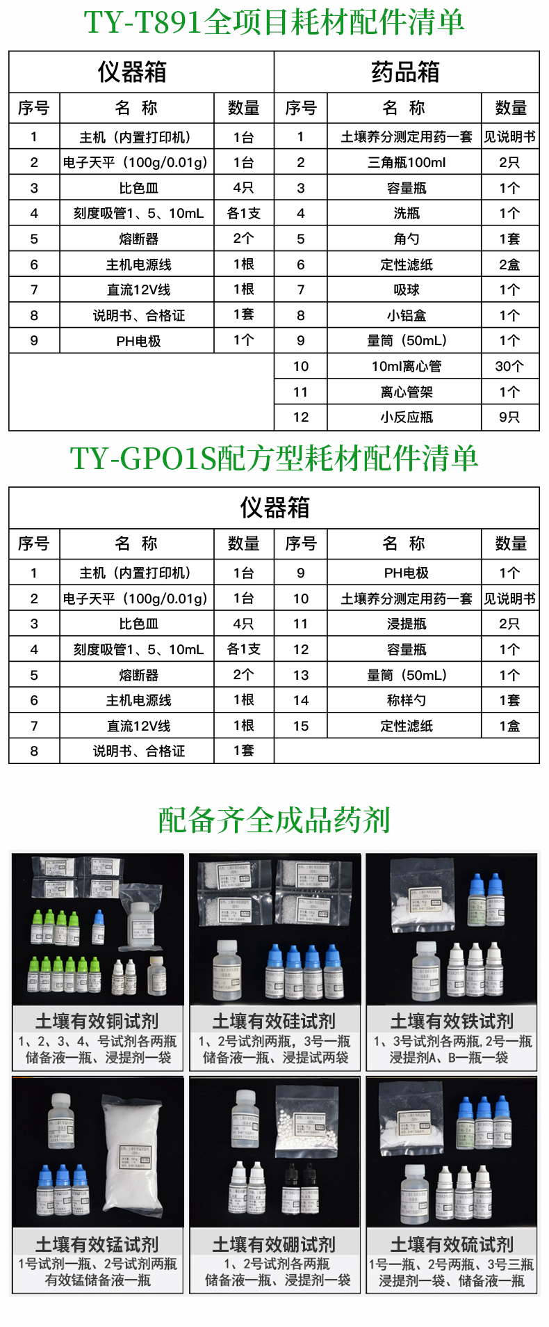 | 全項目土壤肥料養(yǎng)分檢測儀功能全:測試項目國內外*全(各類藥劑均可選購)。 | 配套齊全:該儀器集藥、器、儀為一體,攜帶方便,相當于一個小型實驗室。適于農業(yè)服務部門或農資經銷商、肥料廠商測土施肥和鑒別肥料真假。 | 操作簡便、速度快捷,成品藥劑開瓶即用,無須配置。 |