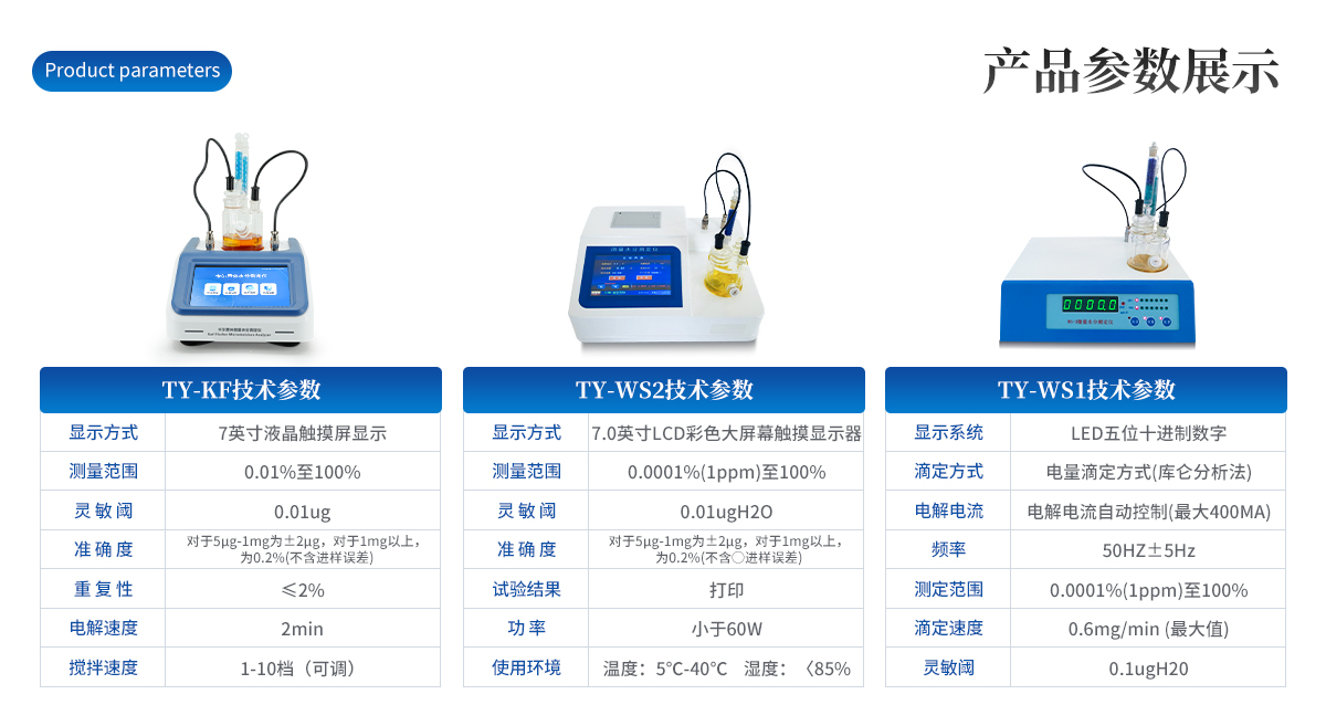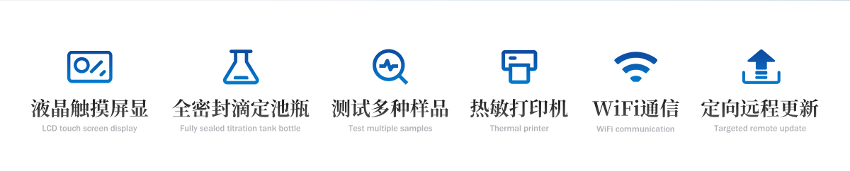 | 1.儀器主控芯片采用ARM Cortex-A7,RK3288/4核處理器,主頻1.88Ghz,運轉(zhuǎn)速度更快速,穩(wěn)定性更強。 | 2.顯示方式:7英寸液晶觸摸屏顯示,人性化中文操作界面,讀數(shù)直觀、簡單。 | 3.儀器采用全密封滴定池瓶,避免試劑與人接觸,杜絕環(huán)境濕度對檢測的影響;檢測過程中儀器自動控制,攪拌、測定60秒左右完成,可直接顯示測定結(jié)果,無需人員頻繁操作。 | 4.儀器內(nèi)置操作視頻,可直接觀看學習操作方法。 | 5.儀器可以測試多種樣品,循環(huán)檢測,即放即檢。 | 6.儀器可對樣品信息自由編輯,包括:樣品名稱、樣品編號、檢測單位、檢測人員、聯(lián)系方式、受檢單位等。 | 7.儀器可對檢測樣品測定信息進行設置,例如:電解電流、電解電壓、微量水分含量、測定時間、百分含量、進樣體積、試樣密度、毛重和皮重等。 | 8.水分檢測方式可根據(jù)實際需求選擇體積法或重量法。 | 9.內(nèi)置熱敏打印機,可直接打印檢測結(jié)果,并可根據(jù)需求靈活設置打印內(nèi)容(二維碼,樣品編號、檢測單位、檢測人員、聯(lián)系電話、受檢單位、檢測日期等)。 | 10.樣品檢測結(jié)果可通過二維碼掃碼查看。 | 11.檢測數(shù)據(jù)可通過歷史記錄進行檢索,通過設置檢測日期、樣品編號、檢測單位、檢測人員、樣品名稱、受檢單位等信息查找對應數(shù)據(jù)。 | 12.儀器配備標準USB接口,免驅(qū)動安裝。檢測結(jié)果存儲容量20萬條以上,可生成Excel表格進行拷貝。 | 13.儀器配備WiFi通信模塊,可上傳數(shù)據(jù)至云平臺,實現(xiàn)電腦端數(shù)據(jù)查詢、瀏覽、分析、統(tǒng)計等。 | 14.儀器可定向遠程更新,進行升級維護,無需返廠更新,節(jié)省時間及人力成本,避免了物流運輸導致設備損壞的潛在風險。 |
