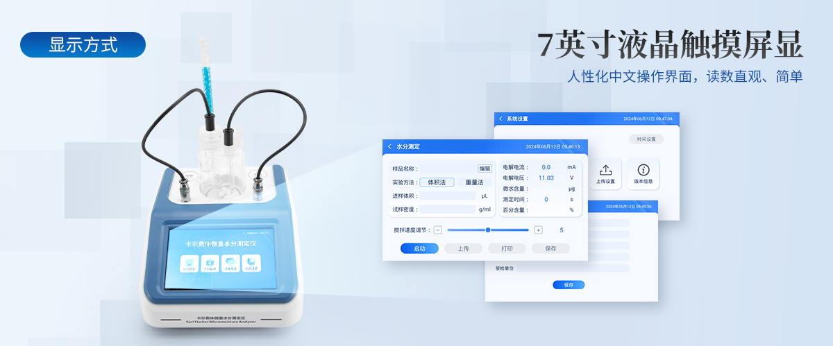 儀器特點:1.儀器主控芯片采用ARM Cortex-A7,RK3288/4核處理器,主頻1.88Ghz,運轉(zhuǎn)速度更快速,穩(wěn)定性更強。2.顯示方式:7英寸液晶觸摸屏顯示,人性化中文操作界面,讀數(shù)直觀、簡單。3.儀器采用全密封滴定池瓶,避免試劑與人接觸,杜絕環(huán)境濕度對檢測的影響;檢測過程中儀器自動控制,攪拌、測定60秒左右完成,可直接顯示測