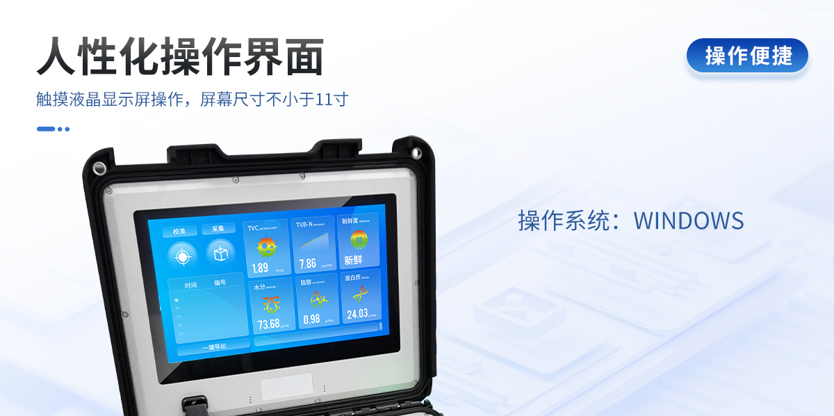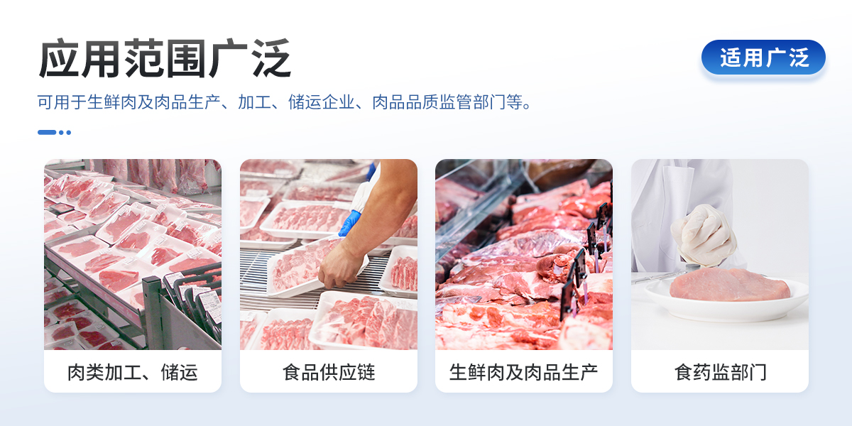 可用于檢測生鮮肉的蛋白質(zhì)、脂肪、水分、pH、TVC、TVB-N、新鮮度、L*、A*、B*等品質(zhì)參數(shù)。配備手提箱式防水減震外殼、大尺寸觸控屏幕并內(nèi)置大容量電池,可一鍵自動校準(zhǔn),是一款適合移動作業(yè)場景的高精度生鮮肉品質(zhì)檢測儀,其可用于生鮮肉及肉品生產(chǎn)、加工、儲運(yùn)企業(yè)、肉品品質(zhì)監(jiān)管部門等。