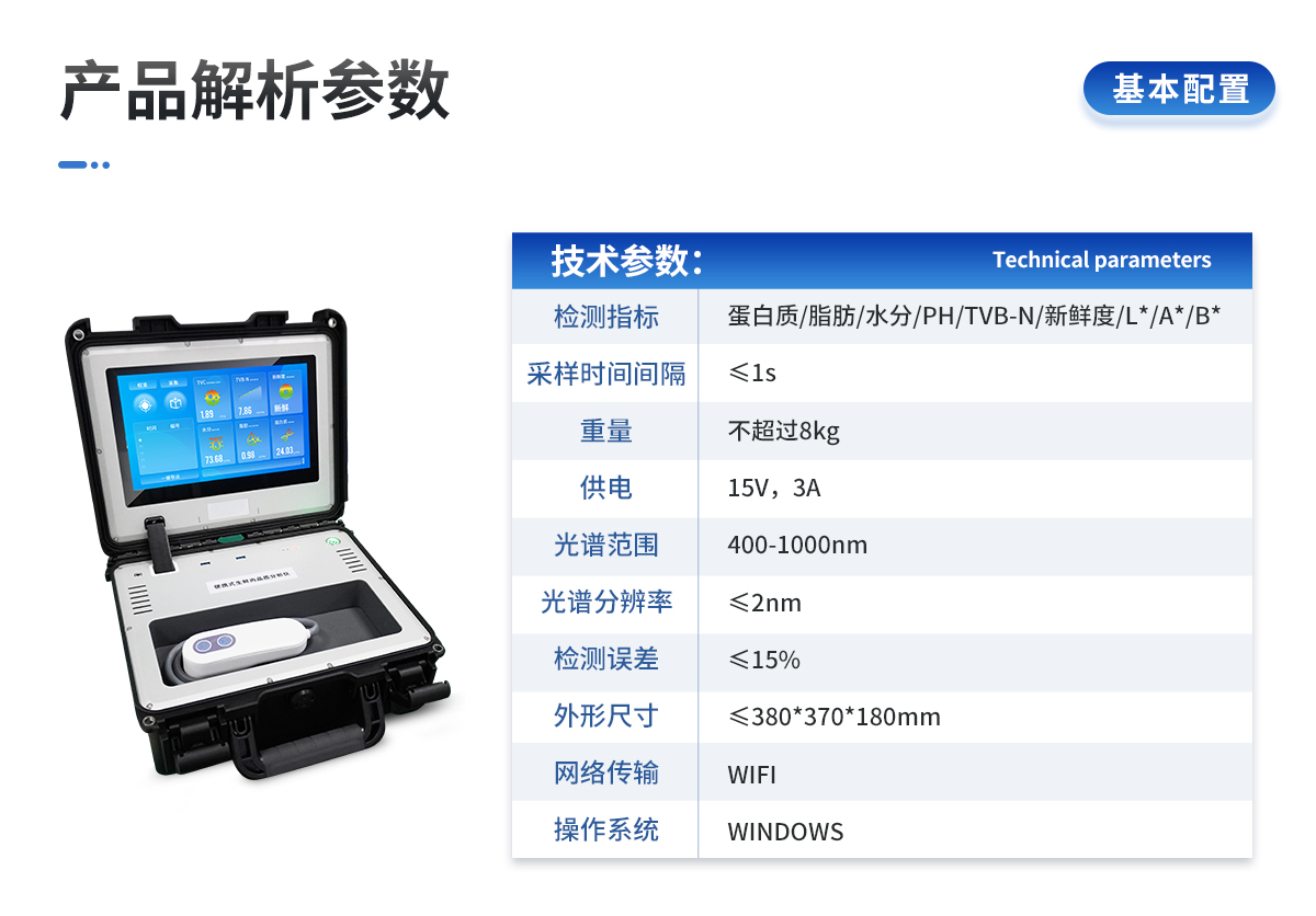 | 1. ※檢測指標(biāo):蛋白質(zhì)、脂肪、水分、PH、TVB-N、新鮮度、L*、A*、B* | 2. 采樣時(shí)間間隔:≤1s | 3. 重量:不超過8kg | 4. 供電:15V,3A | 5. 觸摸液晶顯示屏操作,屏幕尺寸不小于11寸 | 6. ※光譜范圍:400-1000nm | 7. ※光譜分辨率:≤2nm | 8. 檢測誤差:≤15% | 9. ※提供模型自動優(yōu)化平臺,用戶可通過設(shè)備建立和優(yōu)化算法模型 | 10. 外形尺寸:≤380*370*180mm | 11. 網(wǎng)絡(luò)傳輸:WIFI | 12. 操作系統(tǒng):WINDOWS | 13. 采用便攜式手提箱設(shè)計(jì),外殼為ABS防沖擊材料,適合在現(xiàn)場快速檢測 |