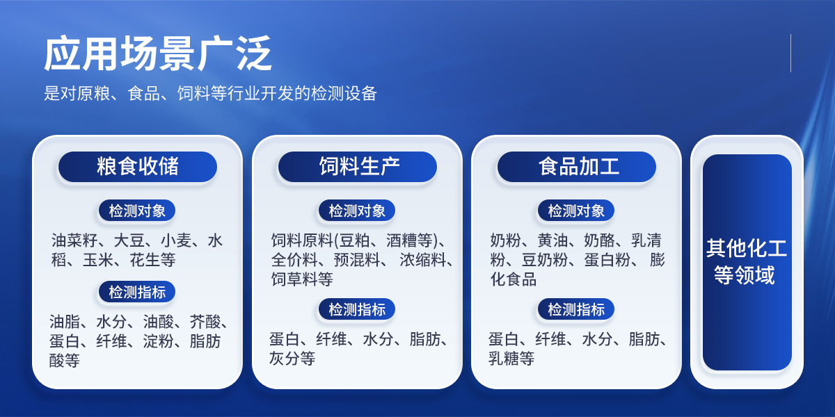 檢測(cè)對(duì)象:油菜籽、大豆、小麥、水稻、玉米、花生等; 檢測(cè)指標(biāo):油脂、水分、油酸、芥酸、蛋白、纖維、淀粉、脂肪酸等; | ◆ 飼料生產(chǎn)