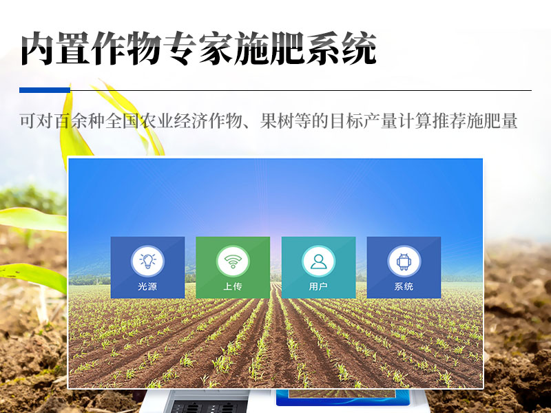 | 1、本儀器集各功能于一身,無需用戶自配附件,可靈活流動檢測。 | 2、安卓(Android)智能操作系統(tǒng),主控芯片采用ARM Cortex-A7,RK3288/4核處理器,主頻1.88Ghz,運轉(zhuǎn)速度更快速,穩(wěn)定性更強。 | 3、雙聯(lián)排12個檢測通道(固態(tài)化設(shè)計),一次性可快速檢測12個樣品,極大提升檢測效率,降低檢測成本。 | 4、檢測過程中內(nèi)置校準功能,智能恒流穩(wěn)壓,光強自動校準,確保檢測準確度。 | 5、內(nèi)置作物專家施肥系統(tǒng),可對百余種全國農(nóng)業(yè)經(jīng)濟作物、果樹等的目標產(chǎn)量計算推薦施肥量,依據(jù)施肥配方科學指導(dǎo)農(nóng)業(yè)生產(chǎn)。測土配方施肥結(jié)果可打印,打印內(nèi)容包含:作物種類、肥料種類、目標產(chǎn)量、需求總量、建議施肥方案。 | 6、儀器標配wifi無線上傳、4G聯(lián)網(wǎng)傳輸、GPRS無線遠傳功能,快速上傳數(shù)據(jù)。 | 7、儀器內(nèi)置大容量內(nèi)存,支持查看全部歷史檢測記錄,以及傳輸所有檢測數(shù)據(jù)。 | 8、配有智慧云農(nóng)業(yè)平臺,儀器連入無線網(wǎng)絡(luò)后,可將檢測數(shù)據(jù)可選擇性或批量無線上傳,方便用戶進行長期數(shù)據(jù)管理和可視化分析。 | 9、儀器同時具有USB接口、以太網(wǎng)接口,并可隨時用U盤拷貝出數(shù)據(jù)。 | 10、可用手機隨時登錄云平臺在線移動查看歷史數(shù)據(jù) | 11、內(nèi)置植物營養(yǎng)診斷標準圖譜,根據(jù)各農(nóng)作物營養(yǎng)缺失的圖片,進行葉面對比,診斷豐缺。 | 12、4波長專業(yè)測試冷光源(紅、藍、綠、橙),光源波長穩(wěn)定,長時間連續(xù)工作光源無溫漂現(xiàn)象,壽命長達10萬小時級別,重現(xiàn)性好,準確度高。 | 13、比色池部分采用標準1cm比色皿,無機械位移及磨損,光路測試定位**,有效屏蔽外光干擾,保證檢測結(jié)果優(yōu)于國標要求。 | 14、儀器系統(tǒng)內(nèi)帶有樣品前處理操作視頻,各種樣品檢測方法點擊視頻模塊即可觀看,檢測人員無需自學說明書,指導(dǎo)教學方便快速,方便新手快速操作。 | 15、內(nèi)置新一代高速熱敏打印機(無需色帶),打印內(nèi)容包含:檢測單位、檢測人員、檢測項目、通道號、吸光度、養(yǎng)分含量(mg/kg)、檢測時間、以及二維碼等信息 | 16、高靈敏7寸真彩觸摸屏,采用更加**和人性化操作,高清晰高交互顯示,大程度降低傳統(tǒng)儀器的繁瑣操作和失誤。 | 17、內(nèi)置時鐘功能,方便操作時間記錄,長期歷史追溯。 | 18、可設(shè)置多賬戶賬號密碼登錄,**UI交互界面,不同的用戶可自由添加編輯檢測信息,保存后可長期使用。 | 19、GPS功能:可在野外作業(yè)時記錄經(jīng)緯度地點,滿足特殊用戶需求。 | 20、內(nèi)置低電壓提示功能,可在檢測時明確電量,避免測試數(shù)據(jù)偏移,同時具有斷電保護功能,斷電自動保存數(shù)據(jù),防止數(shù)據(jù)丟失。 | 21、交直流兩用供電方式,內(nèi)置大容量充電鋰電池,滿電狀態(tài)下可連續(xù)工作10余小時,同時可外接車載電源蓄電。 | 22、儀器具有中英文切換功能,可滿足出口要求。 |