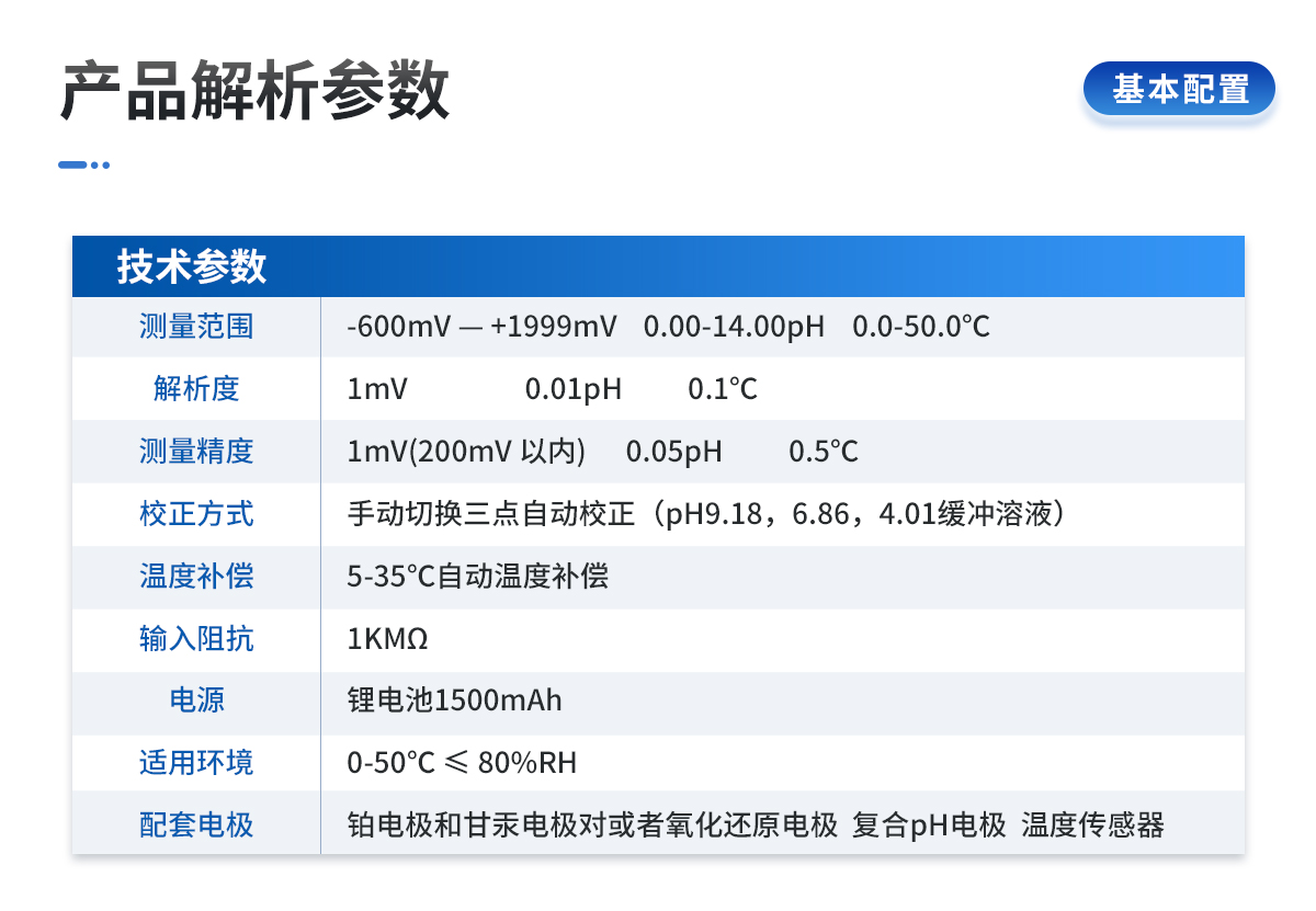 | 測量范圍:-600mV — +1999mV 0.00-14.00pH 0.0-50.0℃ | 解 析 度:1mV 0.01pH 0.1℃ | 測量精度:1mV(200mV 以內(nèi)) 0.05pH 0.5℃ | 校正方式:手動切換三點自動校正(pH9.18,6.86,4.01緩沖溶液) | 溫度補償:5-35℃自動溫度補償 | 輸入阻抗:1KMΩ | 電 源:鋰電池1500mAh | 適用環(huán)境:0-50℃ ≤ 80%RH | 配套電極:鉑電極和甘汞電極對或者氧化還原電極 復(fù)合pH電極 溫度傳感器 | 電 源:4×12V AA電池,連續(xù)工作時間大于20小時 | 測量時間:30-45min | 儀器尺寸:200×85×40 | 重 量:500g |