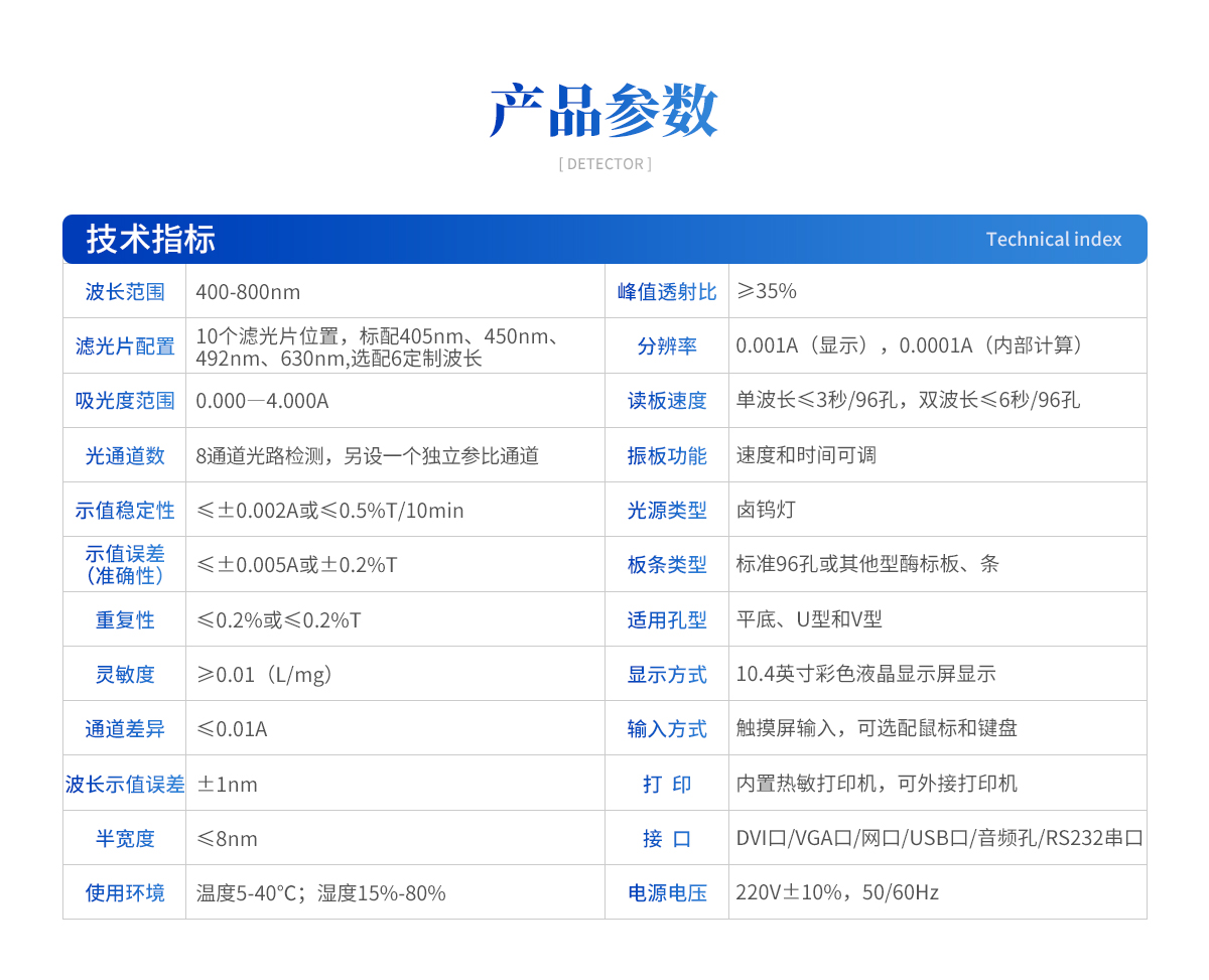 波長范圍: 400-800nm 濾光片配置:10個濾光片位置,標(biāo)配405nm、450nm、492nm、630nm,選配6定制波長 吸光度范圍:0.000―4.000A 光通道數(shù):8通道光路檢測,另設(shè)一個獨(dú)立參比通道 示值穩(wěn)定性:≤±0.002A或≤0.5%T/10min 示值誤差(準(zhǔn)確性):≤±0.005A或±0.2%T 重復(fù)性:≤0.2%或≤0.2%T 靈敏度:≥0.01(L/mg) 通道差異:≤0.01A 波長示值誤差:±1nm 半寬度:≤8nm 峰值透射比:≥35% 分辨率:0.001A(顯示),0.0001A(內(nèi)部計(jì)算) 讀板速度:單波長≤3秒/96孔,雙波長≤6秒/96孔 振板功能:速度和時間可調(diào) 光源類型:鹵鎢燈 板條類型:標(biāo)準(zhǔn)96孔或其他型酶標(biāo)板、條 適用孔型:平底、U型和V型 顯示方式:10.4英寸彩色液晶顯示屏顯示 輸入方式:觸摸屏輸入,可選配鼠標(biāo)和鍵盤 打?。簝?nèi)置熱敏打印機(jī),可外接打印機(jī) 接 口:DVI口、VGA口、網(wǎng)口、USB口、音頻孔、RS232串口 使用環(huán)境:溫度5-40℃;濕度15%-80% 電源電壓:220V±10%,50/60Hz 體積:470mm×350mm×210mm(長×寬×高) 重量:11.5Kg |
