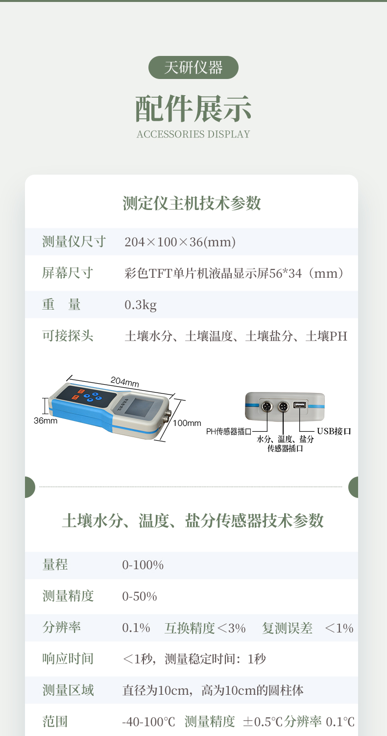 | 土壤水分:(土壤容積含水量:) 單位:%(m3/m3);.測試靈敏度:±0.01 %(m3/m3);.量程:0-100%(m3/m3); 測量精度:0-50%(m3/m3)范圍內(nèi))±2%(m3/m3);50-100%(m3/m3)范圍內(nèi))±3%(m3/m3); 分辨率:0.1% 互換精度:<3% 復(fù)測誤差:<1% 響應(yīng)時間:<1秒 測量穩(wěn)定時間:1秒 測量區(qū)域:直徑為10cm、高為10cm的圓柱體 | 土壤溫度: 范圍:-40-120℃ 測量精度:±0.2℃ 分辨率:±0.1℃ 互換誤差:<0.2℃ 響應(yīng)時間:<100mS 穩(wěn)定時間:<1秒 | 土壤鹽分: