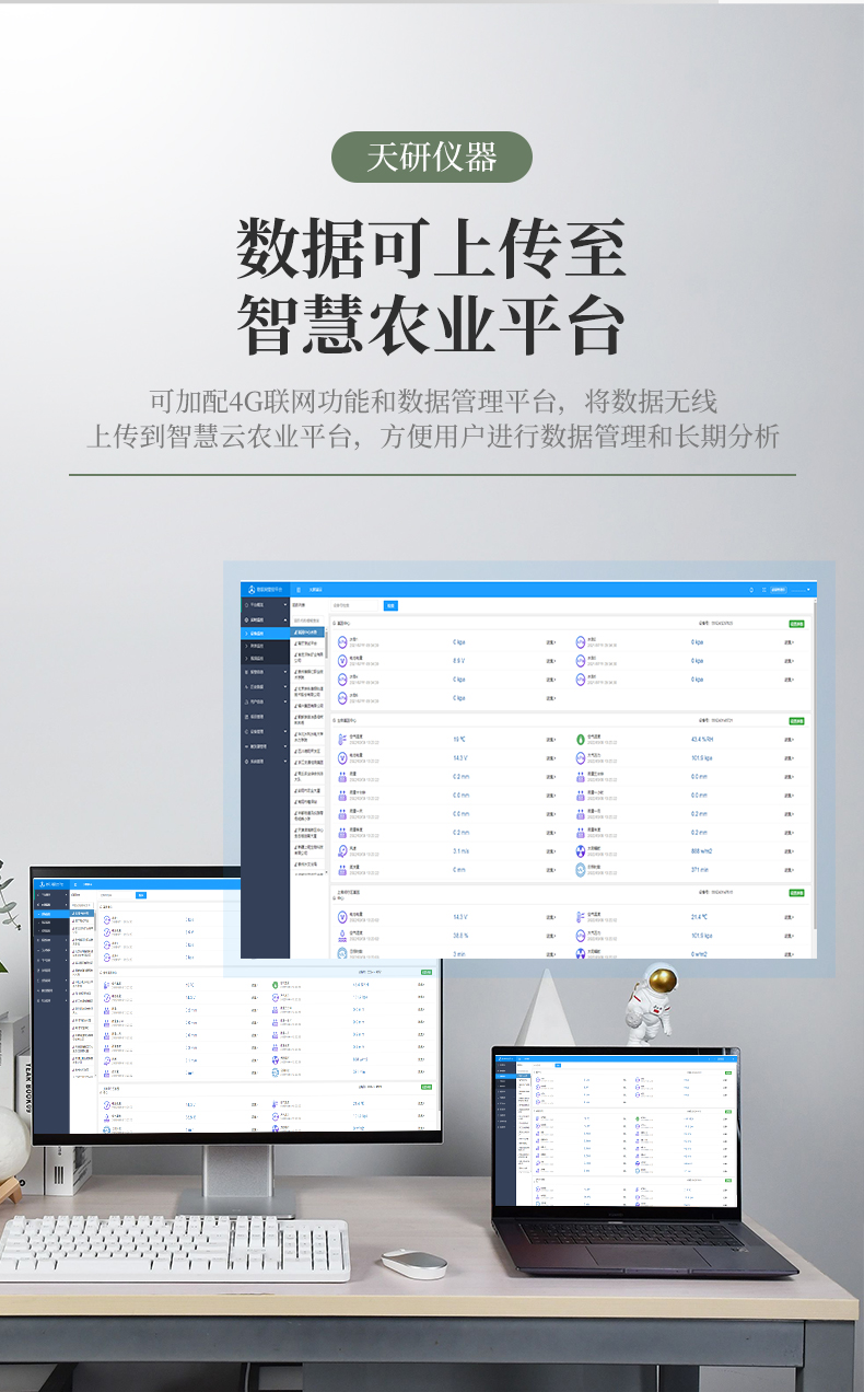 | 儀器可加配4G聯(lián)網(wǎng)功和能數(shù)據(jù)管理平臺,將本機存儲的被測點環(huán)境因子測量歷史數(shù)據(jù)無線上傳到智慧云農(nóng)業(yè)平臺,方便用戶進行數(shù)據(jù)管理和長期分析。 | 本機體積小巧、美觀,操作簡單方便,性能可靠,野外攜帶極為方便。主機連接傳感器后可以手動存儲記錄也可通過主機任意設(shè)置采樣間隔,自動存儲記錄數(shù)據(jù)。 | 大屏幕彩色液晶顯示屏,全程跟蹤記錄各個被測環(huán)境因子的數(shù)值、組數(shù)、低電壓示警,主機內(nèi)置大容量存儲器,可儲存三十萬條數(shù)據(jù),具有斷電數(shù)據(jù)自動存儲保護功能。 | 各個傳感器插入主機后,主機具有自動識別功能,傳感器一致性好,可按需求自行組合傳感器,不同參數(shù)的傳感器接口可以互相轉(zhuǎn)換,對測量精度沒有影響。 | 儀器具有多通道自動檢測擴展功能,可以實現(xiàn)多個傳感器同時接入的同步檢測。 | 上位機軟件功能強大,隨時可以通過USB接口將記錄中的數(shù)據(jù)導(dǎo)出到計算機上,并可以存儲為EXCE表格文件,生成數(shù)據(jù)曲線,以供其它分析軟件進一步進行數(shù)據(jù)處理。具有設(shè)置超限區(qū)域著色功能,超限數(shù)據(jù)變色預(yù)警,可作為環(huán)境評價的一個依據(jù)。 |