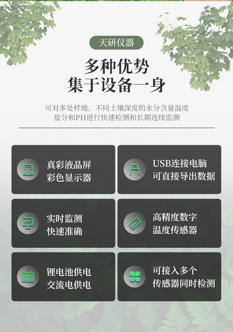 土壤水分測定儀采用FDR頻域反射原理,快速準確測量土壤中含水量,可對多處樣地、不同土壤深度的水分含量進行快速檢測和長期連續(xù)監(jiān)測。廣泛應(yīng)用于土壤墑情檢測、旱作節(jié)水灌溉、精細農(nóng)業(yè)、林業(yè)、地質(zhì)勘探、植物培育等領(lǐng)域。